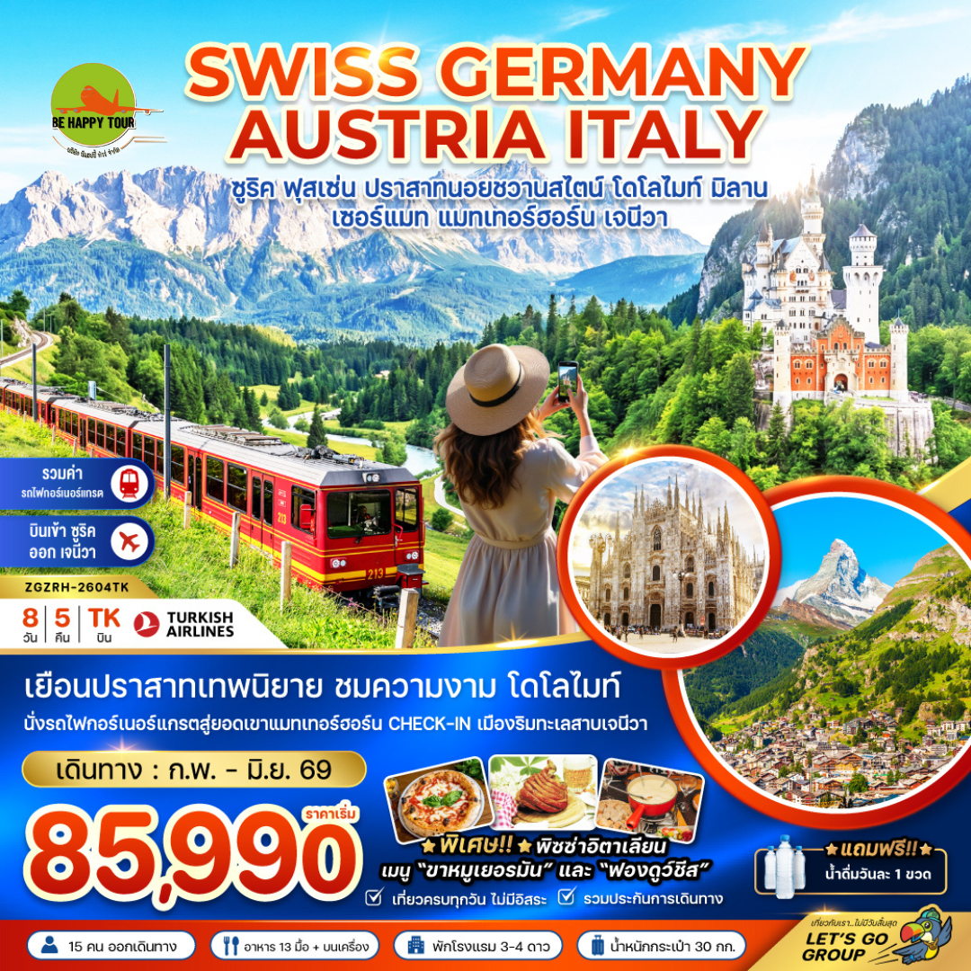 เดินทาง ก.พ. - มิ.ย. 69 | โดยสายการบิน TURKISH AIRLINES (TK) | • เมืองซูริค • ย่านเมืองเก่าซูริค • โบสถ์ฟรอมุนสเตอร์ • โบสถ์หอคอยกรอสมุนเตอร์ • ถนนบานโฮฟซตราสเซอร์ • เมืองฟุสเช่น • ปราสาทนอยชวานซไตน์ • เมืองอินส์บรุค • หลังคาทองคำ • ถนนมาเรียเทเรซ่า • เมืองออร์ติเซ • หมู่บ้านวาล ดิ ฟุเน่ • โบสถ์ซานตา แมดดาลีน่า • เนินเขา Alpe di Siusi • ขุนเขาโดโลไมท์ • เมืองซีร์มิโอเน่ • ทะเลสาบการ์ดา • เมืองมิลาน • มหาวิหารแห่งเมืองมิลาน • ห้างแกลเลอรี่ วิคเตอร์ เอ็มมานูเอล • เมืองทาซ • เมืองเซอร์แมท • นั่งรถไฟกอร์เนอร์แกรต • ยอดเขาแมทเทอร์ฮอร์น • เมืองโลซานน์ • มหาวิหารแห่งโลซานน์ • ศาลาไทย ณ เมืองโลซานน์ • บันไดไม้โบราณ • Chateau d’Ouchy • เมืองเจนีวา • น้ำพุเจ็ทโด้ • ทะเลสาบเจนีวา • โบสถ์เซนต์ปิเตอร์ เจนีวา • จัตุรัส ปลาซดูบูร์ก เดอฟูร์