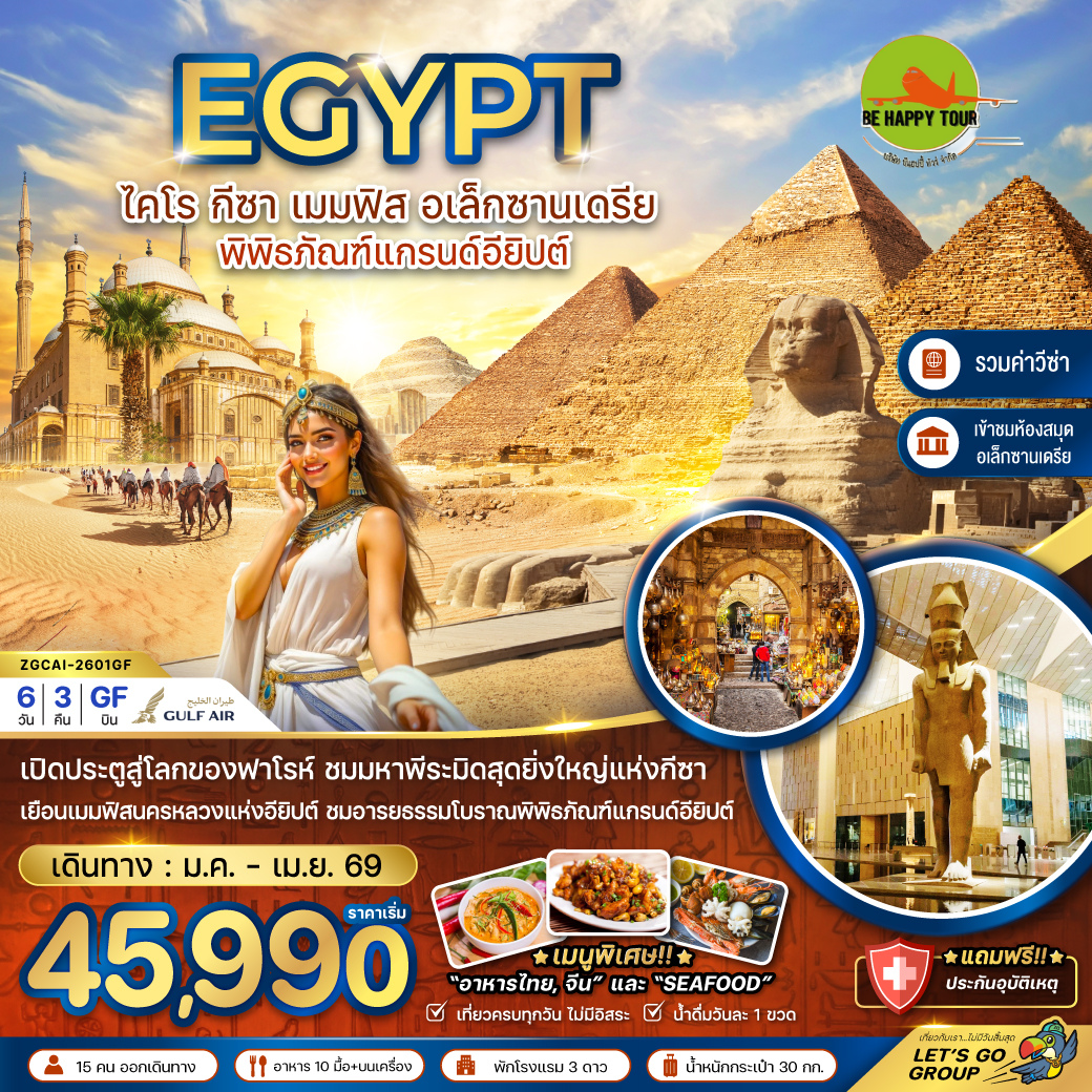 เดินทาง ม.ค. - เม.ย. 69 | โดยสายการบิน GULF AIR (GF) | • กรุงไคโร • อนุสรณ์สถานทหารนิรนาม • สุเหร่าแห่งโมฮัมหมัดอาลี • มัสยิดอิบันตูลูน • โบถส์แขวน • โบสถ์เซนต์เซอร์เจียส • ตลาดข่านเอลคาลิลิ • เมืองเมมฟิส • เมืองโบราณซัคคารา • พีระมิดขั้นบันไดกษัตริย์โจเซอร์ • เมืองกีซา • มหาพีระมิดแห่งกีซา • มหาสฟิงซ์ • โรงงานผลิตหัวน้ำหอม • ศูนย์กลางการทำกระดาษปาปีรุส • เมืองอเล็กซานเดรีย • หลุมฝังศพใต้ดินแห่งอเล็กซานเดรีย • เสาปอมเปย์ • ป้อมปราการซิทาเดล • ห้องสมุดแห่งอเล็กซานเดรีย • กรุงไคโร • ร้านผ้าฝ้าย • พิพิธภัณฑ์แกรนด์อียิปต์ • ซิตี้สตาร์ มอลล์