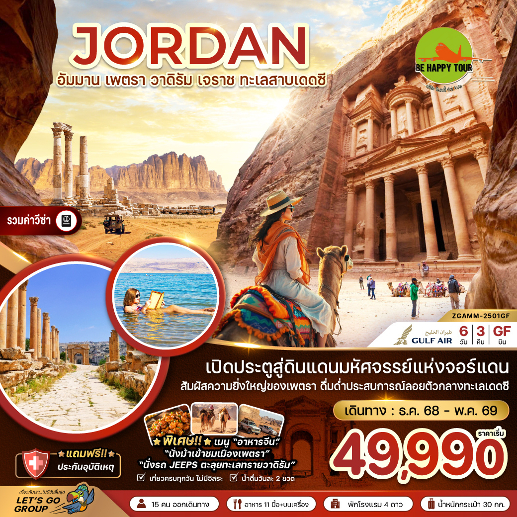เดินทาง ธ.ค. 68 - พ.ค. 69 | โดยสายการบิน GULF AIR (GF) | • เมืองโรมันโบราณเจราช • ประตูกษัตริย์เฮเดรียน • โอวัลพลาซ่า • เสาคอรินเทียน • กรุงอัมมาน • โรงละครอัมมาน • Abdali mall • มหานครเพตรา • วิหารเอล คาซเนห์ • เมืองอควาบา • ทะเลทรายวาดิรัม • นั่งรถจิ๊บชมความสวยงามทะเลทรายวาดิรัม • น้ำพุแห่งลอว์เรนซ์ • เมืองมาดาบา • โบสถ์เซนต์จอร์จ • เมาท์เนโบ • โบสถ์อนุสรณ์โมเสส • อนุสรณ์ไม้เท้าศักดิ์สิทธ์แห่งโมเสส • ผลิตภัณฑ์ที่ทำจากเดดซี • ทะเลสาบเดดซี • ป้อมปราการแห่งกรุงอัมมาน