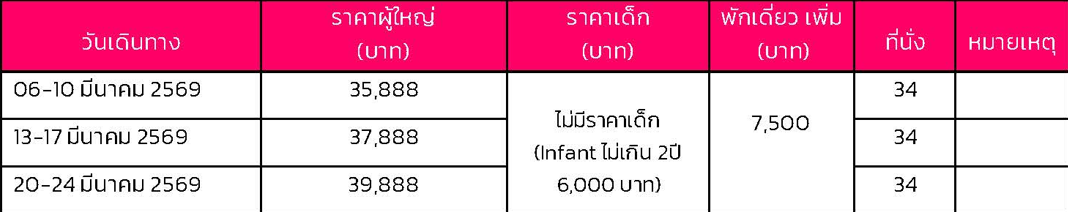 เดินทาง มี.ค. 69 | โดยสายการบิน AIR ASIA X (XJ) | • โตเกียว • ชิบะมาตะ • วัดอาซากุสะ • จังหวัดคานางาวะ • พระใหญ่ไดบุตสึ • ตลาดปลา • เมืองฮาโกเน่ • ศาลเจ้าฮาโกเน่ • โกเทมบะ เอ้าท์เล็ต • จังหวัดยามานาชิ • พักฟูจิออนเซ็น • หมู่บ้านโอชิโนะ ฮักไก • Duty Free • สวนโออิชิปาร์ค • ย่านชินจูกุ • เมืองนาริตะ