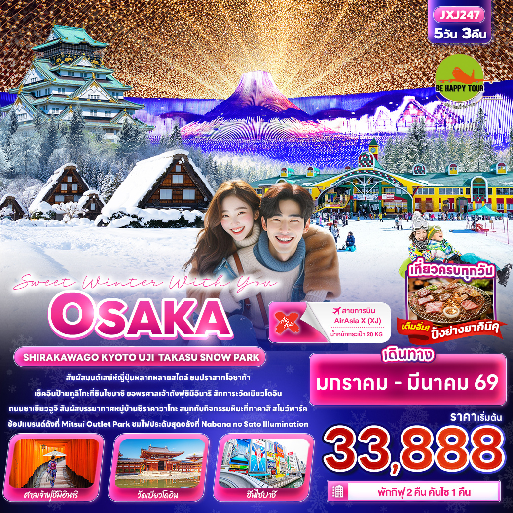 เดินทาง ม.ค. - มี.ค. 69 | โดยสายการบิน AIR ASIA X (XJ) | • โอซาก้า • ปราสาทโอซาก้า • Mitsui outlet Park Jazz Dream Nagashima • ชมงานไฟ Nabana No Sato Winter Illumination • จังหวัดกิฟุ • Takasu Snow Park • หมู่บ้านมรดกโลกชิราคาวาโกะ • Aeon Mall • เกียวโต • วัดเบียวโดอิน • Duty free • ศาลเจ้าฟูชิมิอินาริ • ย่านชินไซบาชิ • เมืองอิซุมิซาโนะ