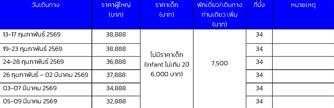 เดินทาง ก.พ. - มี.ค. 69 | โดยสายการบิน AIR ASIA X (XJ) | • Snow World (ไม่รวม Snowmobile) • โอตารุ • คลองสายวัฒนธรรมโอตารุ • เครื่องแก้วโอตารุ • พิพิธภัณฑ์กล่องดนตรี • เมืองอาซาฮิกาวะ • Aeon Mall • พิพิธภัณฑ์ Otokoyama Sake Brewery Museum • สวนสัตว์อาซาฮิยาม่า(รวมค่าเข้าชม) • หมู่บ้านราเมนอาซาฮิคาว่า • ซัปโปโร • Duty free • โรงงานช็อกโกแลต • อิสระท่องเที่ยวตามอัธยาศัย หนึ่งวันเต็ม