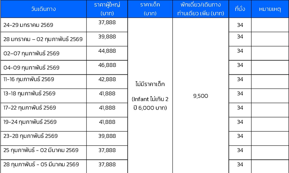 เดินทาง ม.ค. - ก.พ. 69 | โดยสายการบิน AIR ASIA X (XJ) | • โอตารุ • คลองสายวัฒนธรรมโอตารุ • เครื่องแก้วโอตารุ • พิพิธภัณฑ์กล่องดนตรี • เมืองซัปโปโร • โรงงานช็อกโกแลต • Duty free • Hitsujigaoka Snow Park (รวมค่าเข้า) • เมืองบิเอะ • บ่อน้ำสีฟ้า • อาซาฮิคาวะ • อิออนมอลล์ • พิพิธภัณฑ์ Otokoyama Sake Brewery Museum • สวนสัตว์อาซาฮิยาม่า(รวมค่าเข้าชม) • หมู่บ้านราเมนอาซาฮิคาว่า • เมืองฟุราโน่ • นิงเกิ้ลเทอเรส • เมืองซัปโปโร • อิสระท่องเที่ยวตามอัธยาศัย หนึ่งวันเต็ม!