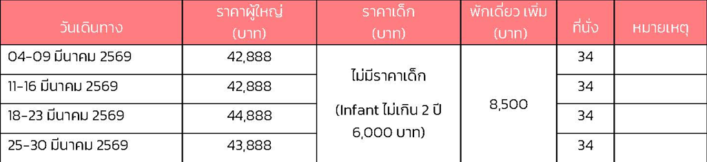 เดินทาง มี.ค. 69 | โดยสายการบิน AIR ASIA X (XJ) | • เมืองโกเบ • ฮาร์เบอร์แลนด์ • โอซาก้า • ปราสาทโอซาก้า(ด้านนอก) • ย่านชินเซไก • เกียวโต • วัดคิโยมิสุเดระ • ถนนชาเขียวเบียวโดอิน โอโมเตะซันโด+วัดเบียวโดอิน • Mitsui outlet Park Shiga Ryuo • จังหวัดกิฟุ • หมู่บ้านมรดกโลกชิราคาวาโกะ • เมืองทาคายาม่า • ย่านเมืองเก่าทาคายาม่า • ย่านซันมาชิซูจิ • จังหวัดนากาโน่ • จังหวัดยามานาชิ • สตรอว์เบอร์รี Fruit farm in Yamanashi • โออิชิปาร์ค • Duty Free • โตเกียว • ย่านชินจูกุ • เมืองนาริตะ