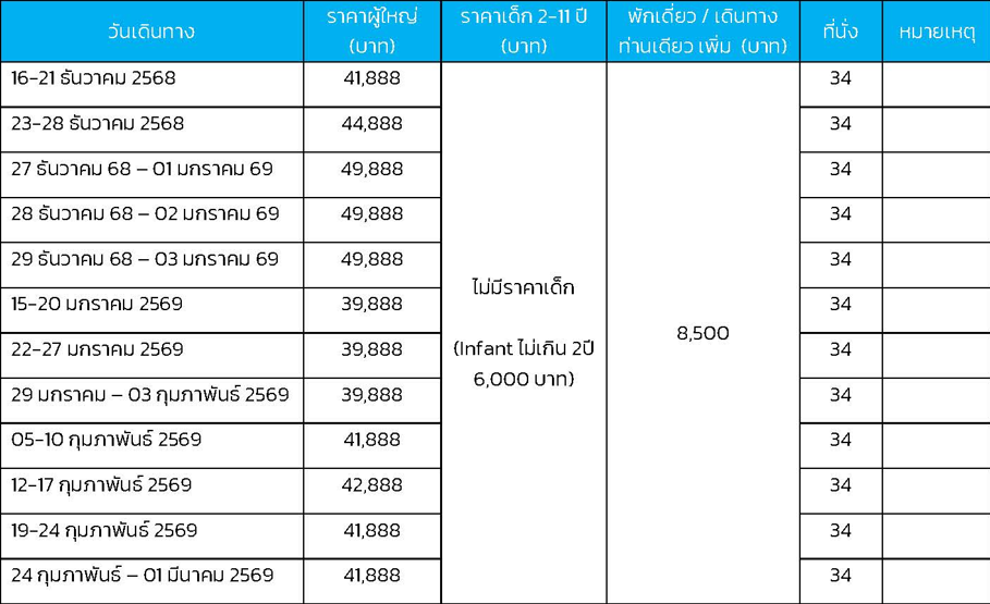 เดินทาง ธ.ค.68 - ก.พ.69 | โดยสายการบิน AIR ASIA X (XJ) | • โตเกียว • วัดอาซากุสะ • ย่านชินจูกุ • จังหวัดยามานาชิ • พักออนเซ็น • Duty Free • สวนโออิชิปาร์ค • เมืองมัตสึโมโต้ • ปราสาทมัตสึโมโต้(ด้านนอก) • วัดเซ็นโคจิ+ถนนนากะมิเซ • Aeon Mall • เมืองทาคายาม่า • ตลาดเช้ามิยากาวะ • ย่านเมืองเก่าทาคายาม่า • ย่านซันมาชิซูจิ • หมู่บ้านมรดกโลกชิราคาวาโกะ • จังหวัดกิฟุ • เกียวโต • วัดคิโยมิสุเดระ • โอซาก้า • ปราสาทโอซาก้า(ด้านนอก) • ย่านชินไซบาชิ • เมืองอิซุมิซาโนะ