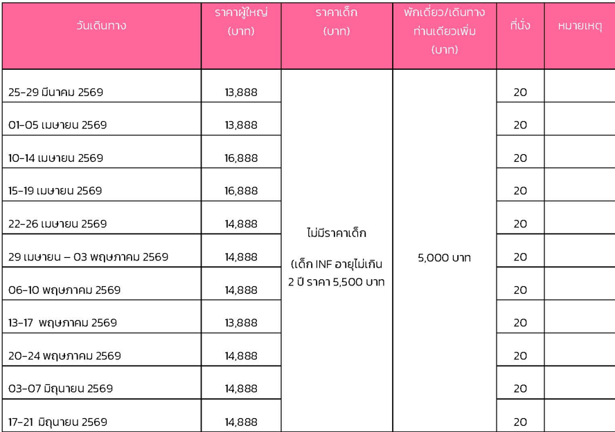 เดินทาง มี.ค. - มิ.ย. 69 | โดยสายการบิน THAI LION AIR (SL) | • ถนนคนเดินหวงซิงลู่ • ตึก IFS • ร้าน POPMART • ฉางเต๋อ • โบราณต้าเสี่ยวเหอเจีย • เมืองโบราณเฟิ่งหวง • รถไฟแม่เหล็ก Maglev(รวมค่ารถแบตเตอรี่และรถไฟแม่เหล็ก Maglev) • สะพานหงส์ • ถนน SHIBAN • เมืองโบราณฟูหรงเจิ้น • น้ำตกฟูหรงเจิ้น • จางเจียเจี้ย • ศูนย์สมุนไพรจีน เทียนเหมินซาน (กระเช้า+รถอุทยาน) • ระเบียงกระจก(รวมผ้าหุ้มรองเท้า) • ชมถ้ำประตูสวรรค์ (บันไดเลื่อน) • OPTION โชว์สุนัขจิ้งจอกขาว หรือ โชว์เสน่ห์เชียงซีซิ่ว • ร้านหยก • ชมหุบเขาป่ายจ้าง • ร้านยางพารา • ฉางซา • ถนนโบราณไท่ผิง • OPTION เขาอวตาร • CHANGSHA BAILIAN OUTLET