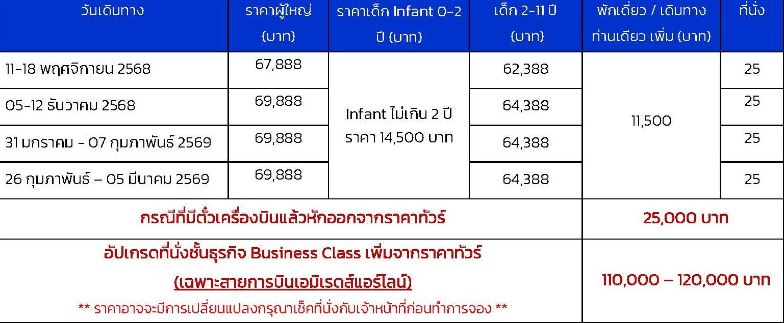 เดินทาง พ.ย.68 - ก.พ.69 | โดยสายการบิน EMIRATES (EK) | • เมืองซากอร์ส • โบสถ์โฮลีทรินิตี้ • กรุงมอสโก • สแปร์โรว์ ฮิลล์ • มหาวิหารเซนต์ซาเวียร์ • ประตูชัย • สวนวิคตอรี่ • พระราชวังเครมลิน • มหาวิหารอัสสัมชัญ • ปืนใหญ่พระเจ้าซาร์ • ระฆังพระเจ้าซาร์ • จัตุรัสอาสนวิหาร • พิพิธภัณฑ์อาร์เมอร์รี่ • สวน อเล็กซานเดอร์ รัสเซีย • จัตุรัสแดง • มหาวิหารเซนต์บาซิล • สุสานเลนิน • ห้างสรรพสินค้ากุม • จัตุรัสโรงละคร • สวน Zaryadye • ชมการแสดงคณะละครสัตว์มอสโคว์เซอร์คัส • ตลาดอิสมายลอฟกี้ • สถานีรถไฟใต้ดิน • ช้อปปิ้งถนนอารบัท • เมืองเซ็นต์ปีเตอร์สเบิร์ก • ป้อมปีเตอร์แอนด์ปอล • โบสถ์หยดเลือด • พระราชวังนิโคลัส • รูปปั้นคนขี่ม้า • พระราชวังปีเตอร์ฮอฟ • พิพิธภัณฑ์เฮอร์มิเทจ • มหาวิหารเซนต์ไอแซค • Dinner with Caviar & Champagne & Show • อาสนวิหารสโมลนี • พระราชวังแคทเธอรีน • ช้อปปิ้ง พัลโคโวเอาท์เล็ต