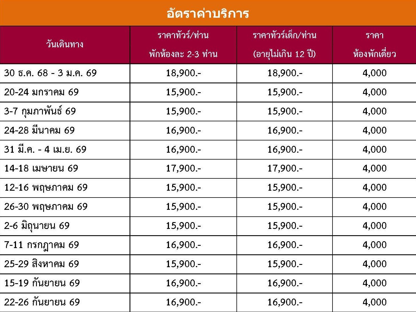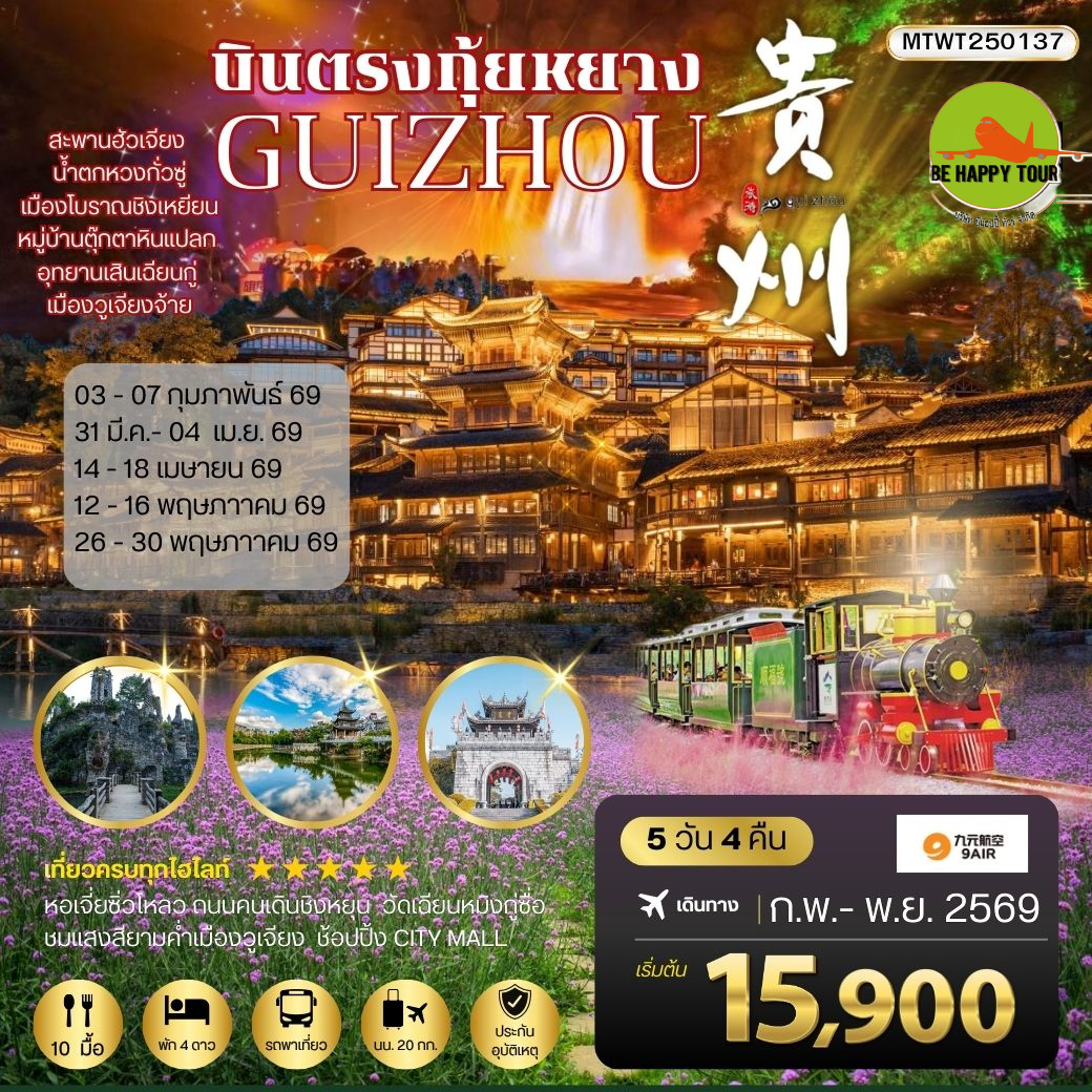 เดินทาง ก.พ. - ธ.ค. 69 | โดยสายการบิน 9AIR (AQ) | • เมืองกุ้ยหยาง • ถนนคนเดินชิงหยุน • หอเจี่ยซิ่วโหลว • วัดเฉียนหมิงกู่ซื่อ • อุทยานเสินเฉียนกู่ • น้ำตกหวงกั่วซู่ประดับไฟ • เมืองอันซุ่น • สะพานฮัวเจียงแกรนด์แคยแน • เมืองโบราณวูเจียงจ้าย • ชมแสงสียามค่ำเมืองวูเจียงจ้าย (พักรีสอร์ตในอุทยาน) • เมืองตุ๊กตาหินประหลาดเยี่ยหลางกู่ • เมืองโบราณชิงเหยียน • พิพิธภัณฑ์เหล้าจีน