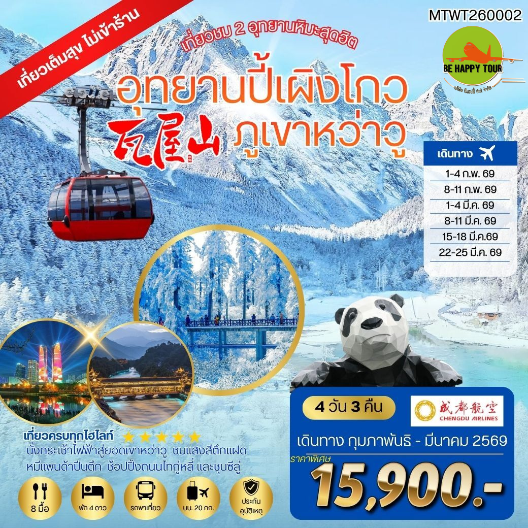 เดินทาง ก.พ. - มี.ค. 69 | โดยสายการบิน CHENGDU AIRLINES (EU) | • นครเฉิงตู • เดินทางสู่อุทยานปี้เผิงโกว • เที่ยวชมอุทยานปี้เผิงโกว • เมืองตูเจียงเยี่ยน • สะพานหนานเฉียว • ภูเขาหว่าวู • เมืองเฉิงตู • ชมแสงสีตึกแฝด • ถนนไท่กู่หลี่ • วัดต้าฉือ • หมีแพนด้าปีนตึก • อิสระ ช้อปปิ้ง ณ ถนนชุนซีลู่