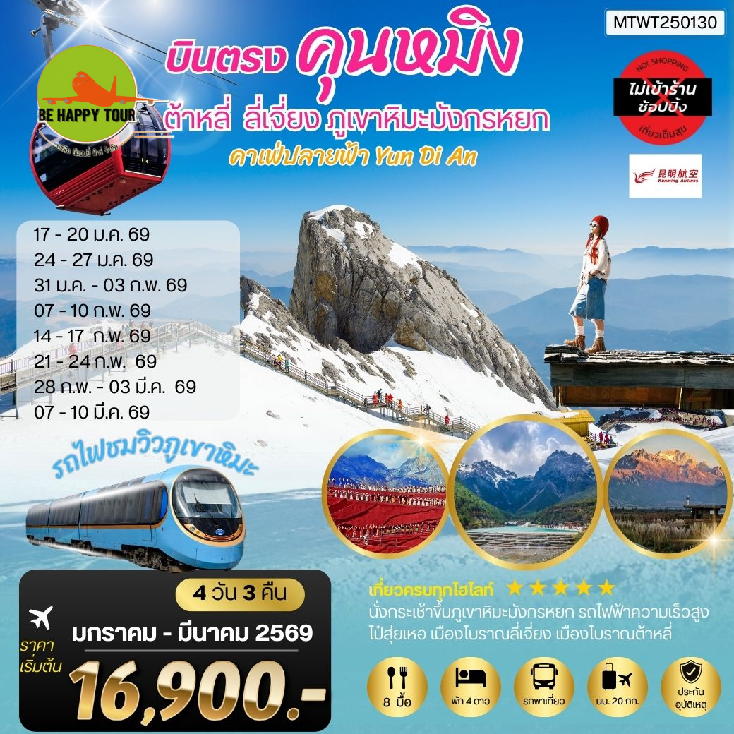 เดินทาง ม.ค. - มี.ค. 69 | โดยสายการบิน KUNMING AIRLINES (KY) | • นครคุนหมิง • เมืองลี่เจียง • คาเฟ่ปลายขอบฟ้า • สระน้ำมังกรดำ • เมืองโบราณลี่เจียง • ภูเขาหิมะมังกรหยก • อุทยานไป๋สุ่ยเหอ(หุบเขาพระจันทร์สีน้ำเงิน) • ชมการแสดง IMPRESSION OF LIJIANG • เมืองฉูสง • วัดหยวนทง • ช้อปปิ้งย่านนานผิงเจีย