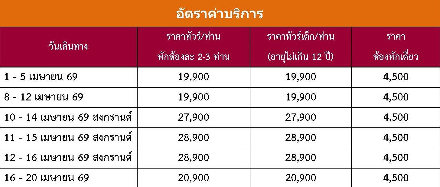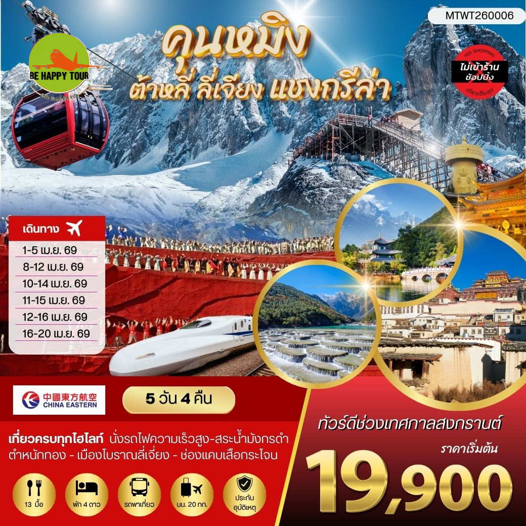 เดินทาง เม.ย. 69 | โดยสายการบิน CHINA EASTERN AIRLINES (MU) | • นครคุนหมิง • เมืองต้าหลี่ • วัดเจ้าแม่กวนอิมแปลงกาย • เจดีย์สามองค์ • เมืองแชงกรีล่า • วัดซงจ้านหลิน • ช่องแคบเสือกระโจน • สระน้ำมังกรดำ • เมืองโบราณลี่เจียง • ภูเขาหิมะมังกรหยก • อุทยานไป๋สุ่ยเหอ(หุบเขาพระจันทร์สีน้ำเงิน) • ตำหนักทอง • ช้อปปิ้งย่านนานผิงเจีย
