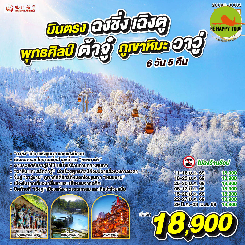 เดินทาง มี.ค. 69 | โดยสายการบิน SICHUAN AIRLINES (3U) | • ฉงชิ่ง • แม่น้ำแยงซี • ตรอกโบราณเซี่ยฮ่าวหลี่ • หงหยาต้ง • ผาหินแกะสลักต้าจู๋ • หว่าอูซาน • เมืองโบราณเหมยซาน