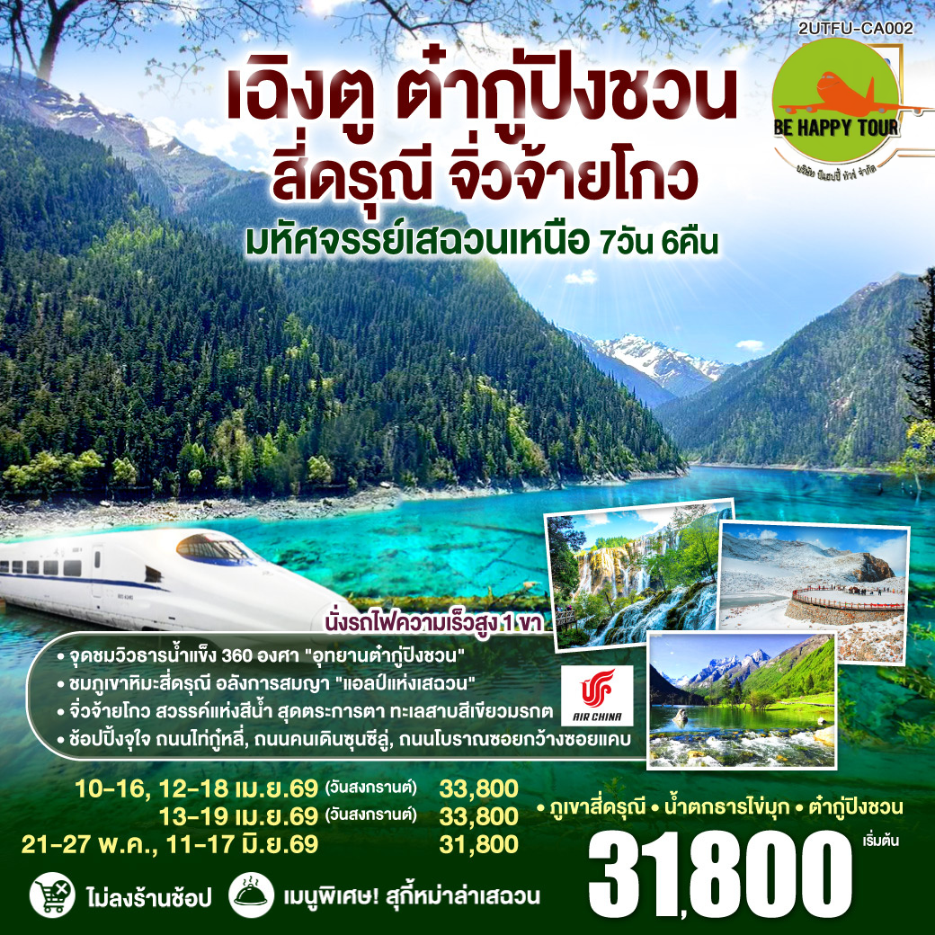 2UTFU-CA002 เฉิงตู ต๋ากู่ปิงชวน สี่ดรุณี จิ่วจ้ายโกว มหัศจรรย์เสฉวนเหนือ*ไม่ลงร้านช้อป*(7 วัน 6 คืน)(CA)(APR-JUN26)