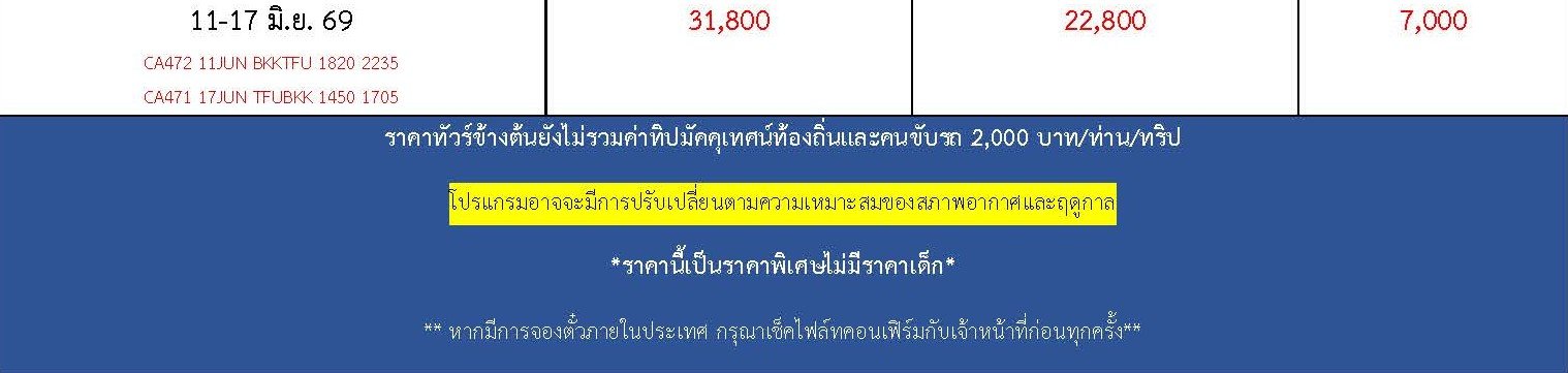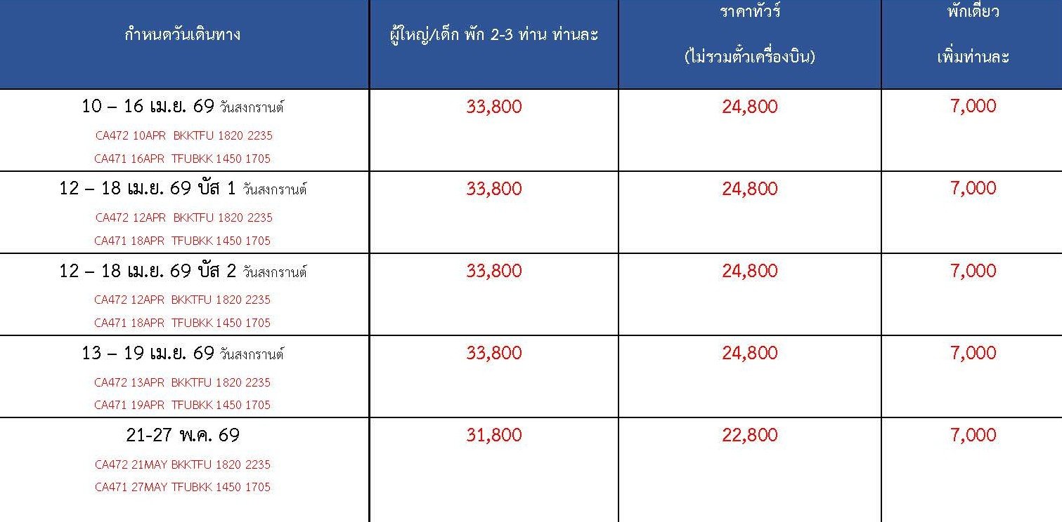 เดินทาง เม.ย. - มิ.ย. 69 | โดยสายการบิน AIR CHINA (CA) | • เฉิงตู • Eastern Suburban Memory • จิ่วจ้ายโกว • อุทยานแห่งชาติจิ่วจ้ายโกว • เมืองเตี๋ยซี • อุทยานสวรรค์ภูเขาหิมะการ์เซียต๋ากู่ปิงชวน • เมืองตูเจียงเยี่ยน • สะพานโบราณหนานเฉียว น้ำตาสีฟ้า • ภูเขาสี่ดรุณี • หุบเขาซวงเฉียวโกว • ถนนโบราณซอยกว้างซอยแคบ • วัดต้าฉือ • ไท่กู่หลี่ • IFS (แพนด้าปีนตึก) • ถนนคนเดินชูลซีลู่