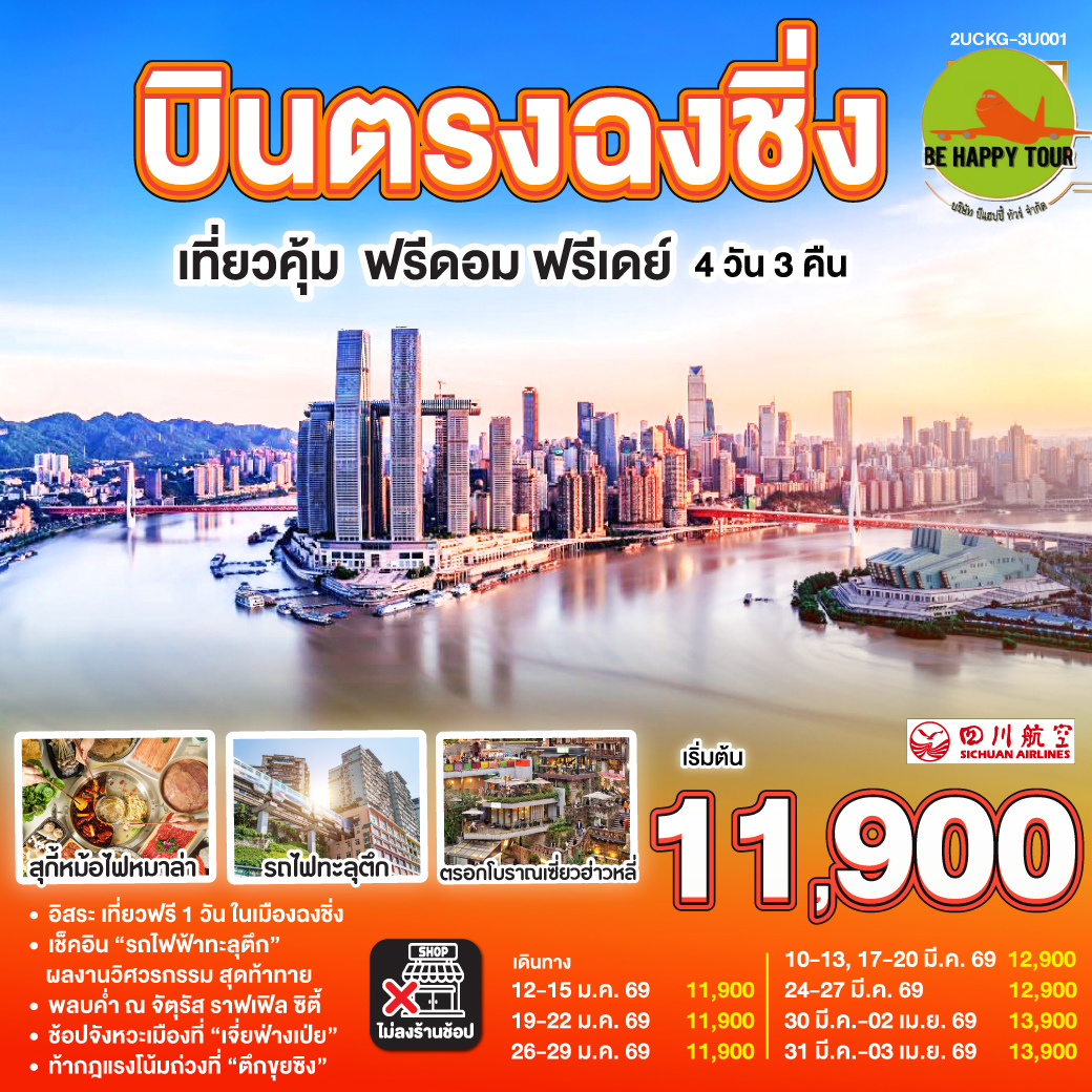 เดินทาง มี.ค. 69 | โดยสายการบิน SICHUAN AIRLINES (3U) | • ฉงชิ่ง • ลี่จื่อปา • ตรอกโบราณเซี่ยฮ่าวหลี่ • บันไดเลื่อนคราวน์ • หวงกวน • ฉือชี่โข่ว • ตึกขุยซิ่ง • Raffles City