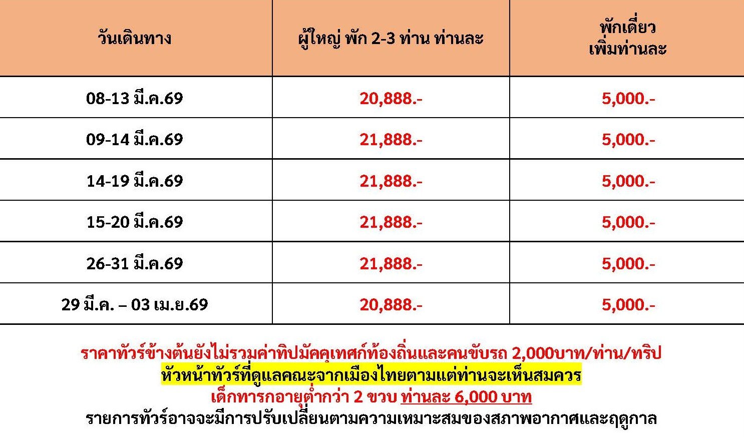 เดินทาง มี.ค. 69 | โดยสายการบิน SPRING AIRLINES (9C) | • เมืองกุ้ยหยาง • สวนดอกซากุระผิงปา • ไร่ดอกมัสตาร์ด • หมู่บ้านชนเผ่าแม้วซีเจียง • เมืองไคลี่ • เมืองโบราณเซียสือ • เมืองโบราณไท่ผิง • เมืองฉงจั่ว • น้ำตกเต๋อเทียน • ร้านกาแฟน้ำตกเต๋อเทียน • ถ้ำน้ำแข็งหลงกง • ระเบียงภาพเขียนหมื่นลี้หมิงสือ • หนานหนิง • เขาชิงซิ๋ว • ศาลเจ้าแม่กวนอิมพันกร • ถนนคนเดินถนนสามตอกสองซอย+POP MART