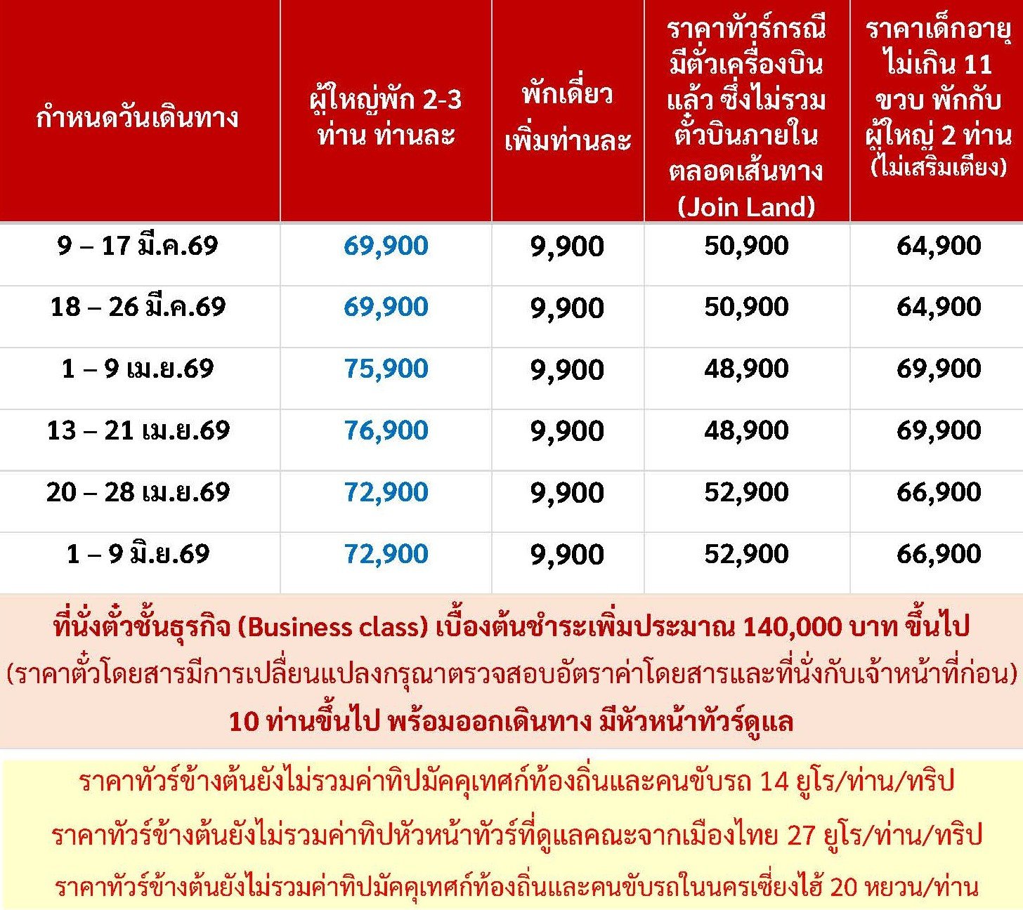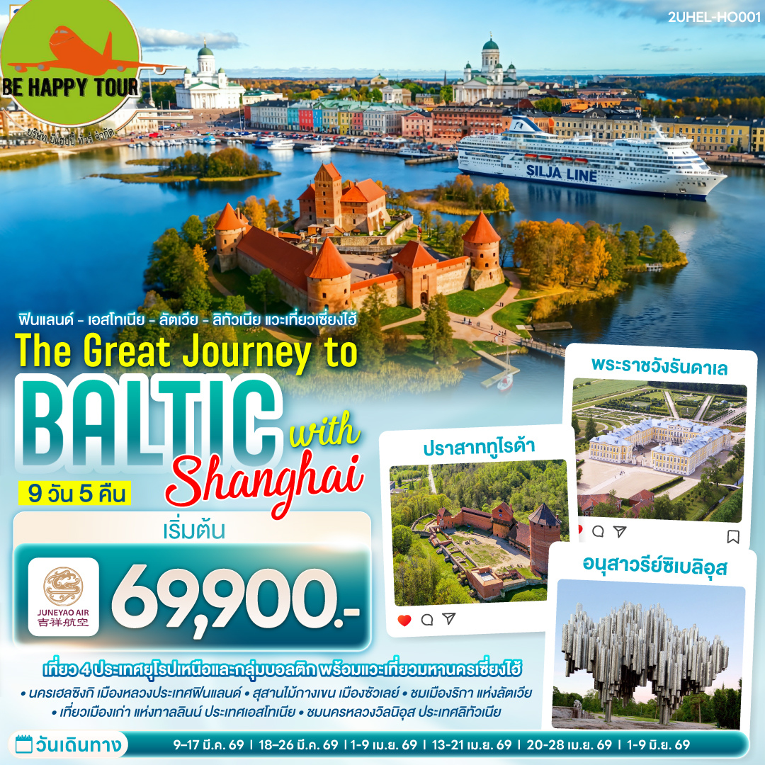 เดินทาง มี.ค. - มิ.ย. 69 | โดยสายการบิน JUNEYAO AIR (HO) | • เฮลซิงกิ • เรือสำราญ Tallink Silja Line • เมืองเก่าทาลลินท์ • ย่านทูมเปีย • พาร์นู • บ้านไม้ Wooden House • ซิกุลด้า • ปราสาททูไรด้า • เมืองเก่าริกา • ฟิลส์รันดาเล • พระราชวังรันดาเล • ซัวเลย์ • สุสานไม้กางเขน • เคานัส • ปราสาททราไค • วิลนิอุส • เฮลซิงกิ • จัตุรัสซีเนท • มหาวิหารอุสเพนสเก้ • มาร์เก็ตสแควร์ • นครเซี่ยงไฮ้ย่านนอร์ทบันด์ • วัดพระหยก • ตลาด 100 ปีเฉินหวางเมี่ยว • ถนนนานกิง