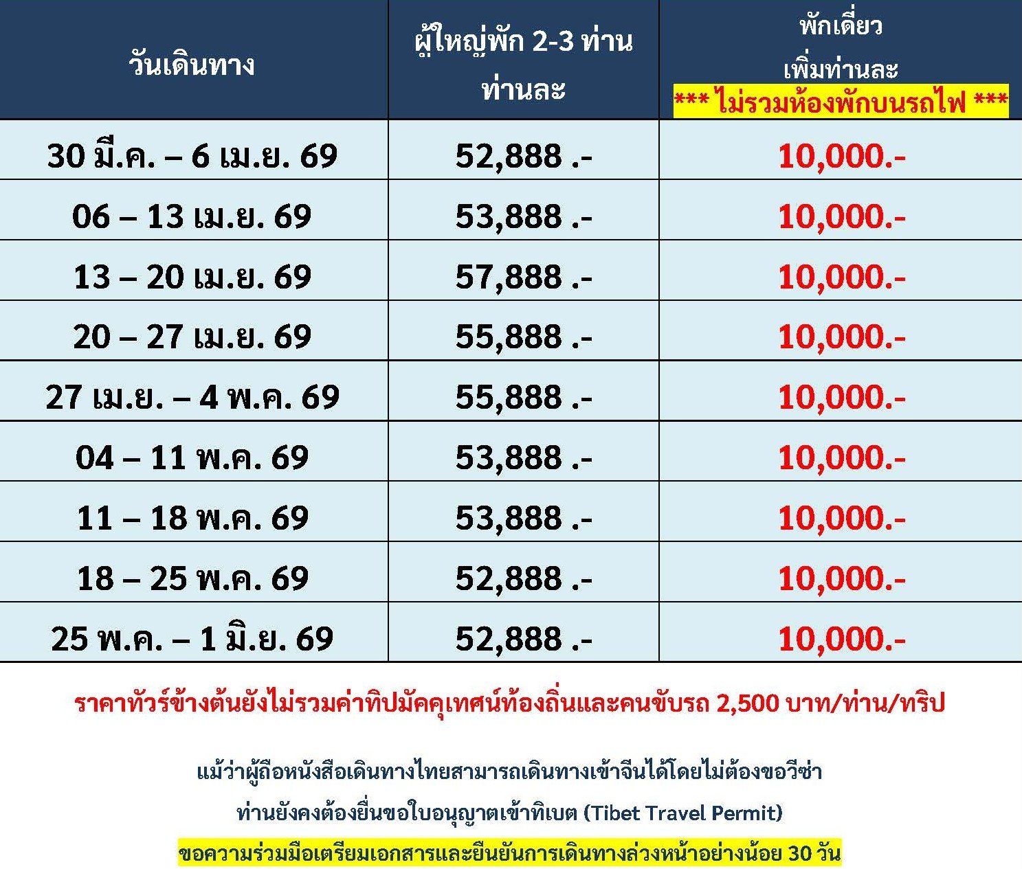 เดินทาง มี.ค. - พ.ค. 69 | โดยสายการบิน THAI VIET JET (VZ) | • ซีหนิง • ลาซา • พระราชวังฤดูร้อน • นอร์บูลิงคา • พิพิธภัณฑ์ทิเบต • หลินจือ • ป่าโบราณจวี้ป๋อ • หุบเขาคาติ้งโกว • ทะเลสาบปาซง • พระราชวังโปตาลา • วัดโจคัง • ตลาดบาคอร์ • พิพิธภัณฑ์ชิงไห่