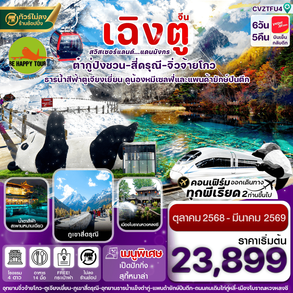 เดินทาง ต.ค.68 - มี.ค.69 | โดยสายการบิน THAI VIET JET (VZ) | • ต๋ากู่ปิงชวน • ภูเขาสี่ดรุณี • จิ่วจ้ายโกว • วัดต้าฉือ • แพนด้าเซลฟี่ • หมีแพนด้ายักษ์ปีนตึก • ถนนคนเดินไท่กู่หลี่ • ถนนคนเดินชุนซีลู่