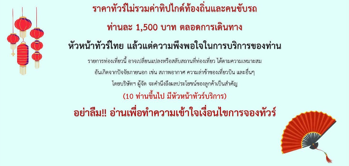เดินทาง ธ.ค.68 - ก.ค.69 | โดยสายการบิน 9AIR (AQ) | • ฮวาเจียง แกรนด์ แคนยอน • หมู่บ้านวู่เจียงจ้าย • น้ำตกหวงกั่วซู • หอโบราณเจี่ยเชี่ยงโหลว • เมืองโบราณชิงเหยียน • ถนนคนเดินชิงหยุน