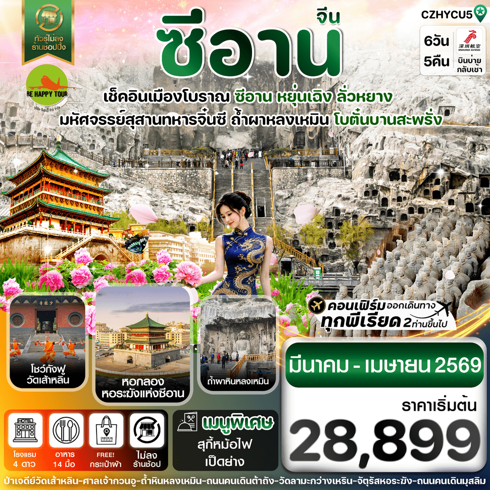 เดินทาง มี.ค. - เม.ย. 69 | โดยสายการบิน SHENZHEN AIRLINES (ZH) | • ซีอาน • หยุ่นเฉิง • ลั่วหยาง • วัดเส้าหลิน • ถ้ำผาหินหลงเหมิน • สุสานกองทัพทหารดินเผา • เจดีย์ห่านป่าใหญ่ • กำแพงเมืองโบราณซีอาน