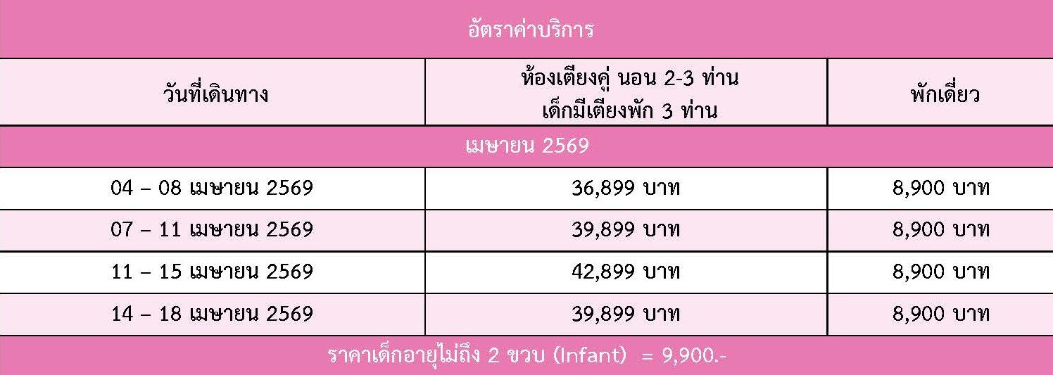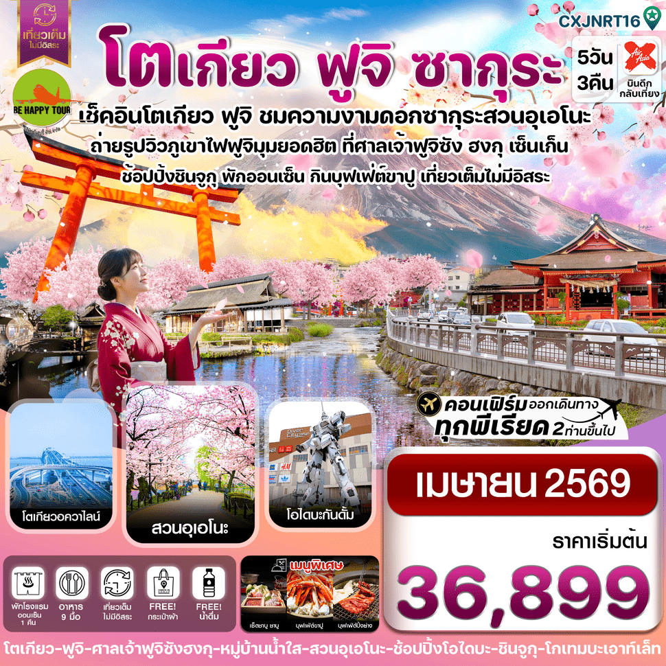 เดินทาง เม.ย. 69 | โดยสายการบิน AIR ASIA X (XJ) | • สวนซากุระ อุเอโนะ • หมู่บ้านน้ำใส โอชิโนะ ฮักไก • ศาลเจ้าฟูจิซัง ฮงกุ เซ็นเก็น • อ่าวโตเกียว โตเกียวเบย์ อควาไลน์ • วัดอาซากุสะ • ถนนนากามิเซะ • ชินจูกุ • โกเทมบะ • พรีเมี่ยม เอาท์เล็ท • ไดเวอร์ซิตี้
