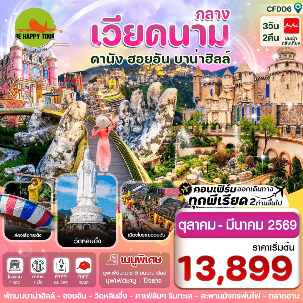 เดินทาง ต.ค. - มี.ค. 69 | โดยสายการบิน AIR ASIA (FD) | • บาน่าฮิลล์ • สะพานมือสีทอง • เรือกระด้ง • เมืองโบราณฮอยอัน • สะพานมังกรพ่นไฟ • ตลาดฮาน • เจ้าแม่กวนอิม ณ วัดหลินอึ๋ง • คาเฟ่ริมทะเล สไตล์ซานโตรินี่