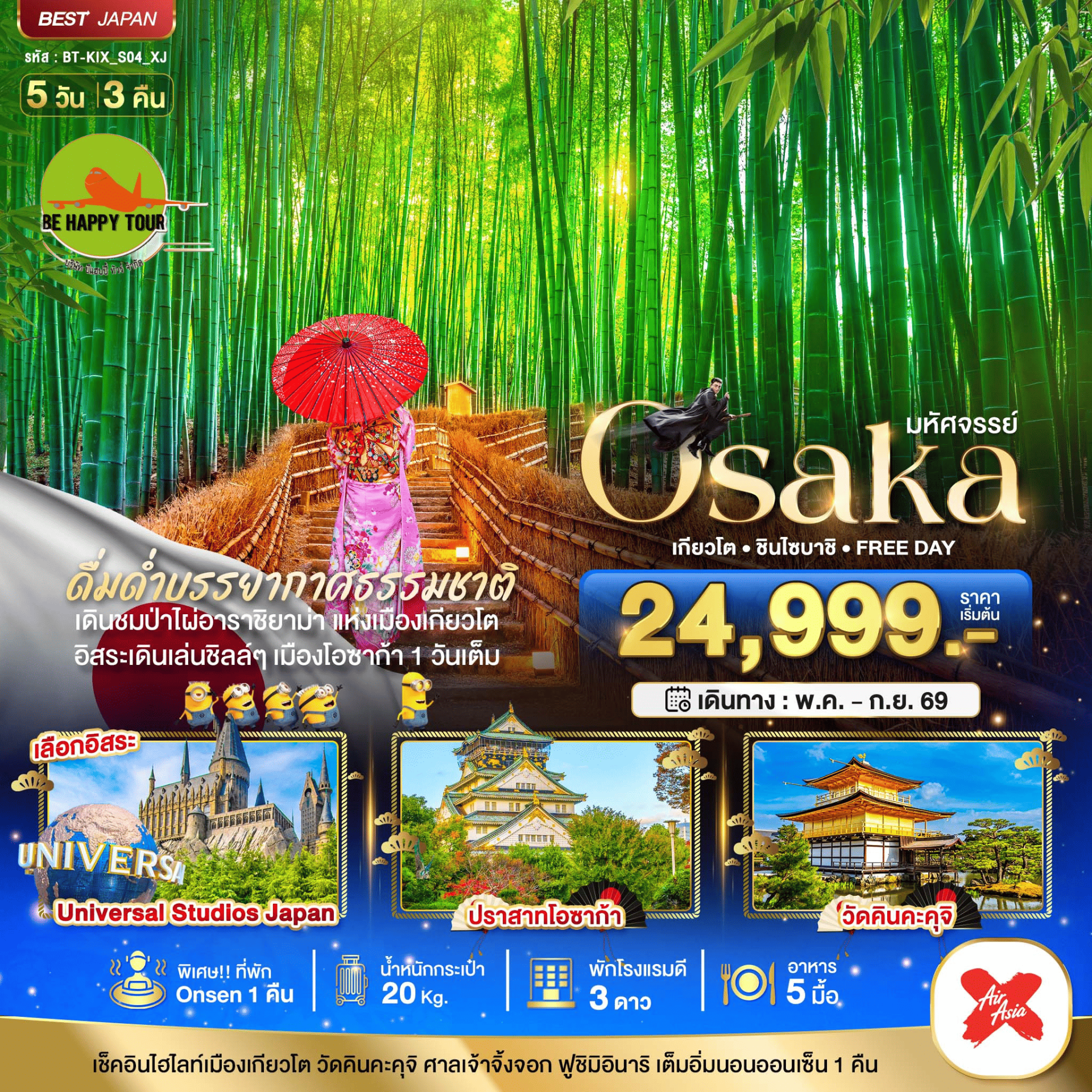 เดินทาง พ.ค. - ก.ย. 69 | โดยสายการบิน AIR ASIA X (XJ) | • คันไซ ประเทศญี่ปุ่น • เมืองเกียวโต • ป่าไผ่อาราชิยาม่า • สะพานโทเก็ตสึเคียว • วัดคินคะคุจิ(วัดทอง) • ศาลเจ้าฟูชิมิอินาริ • พิธีชงชาญี่ปุ่น • ปราสาทโอซาก้า • เมืองโอซาก้า • ย่านชินไซบาชิ