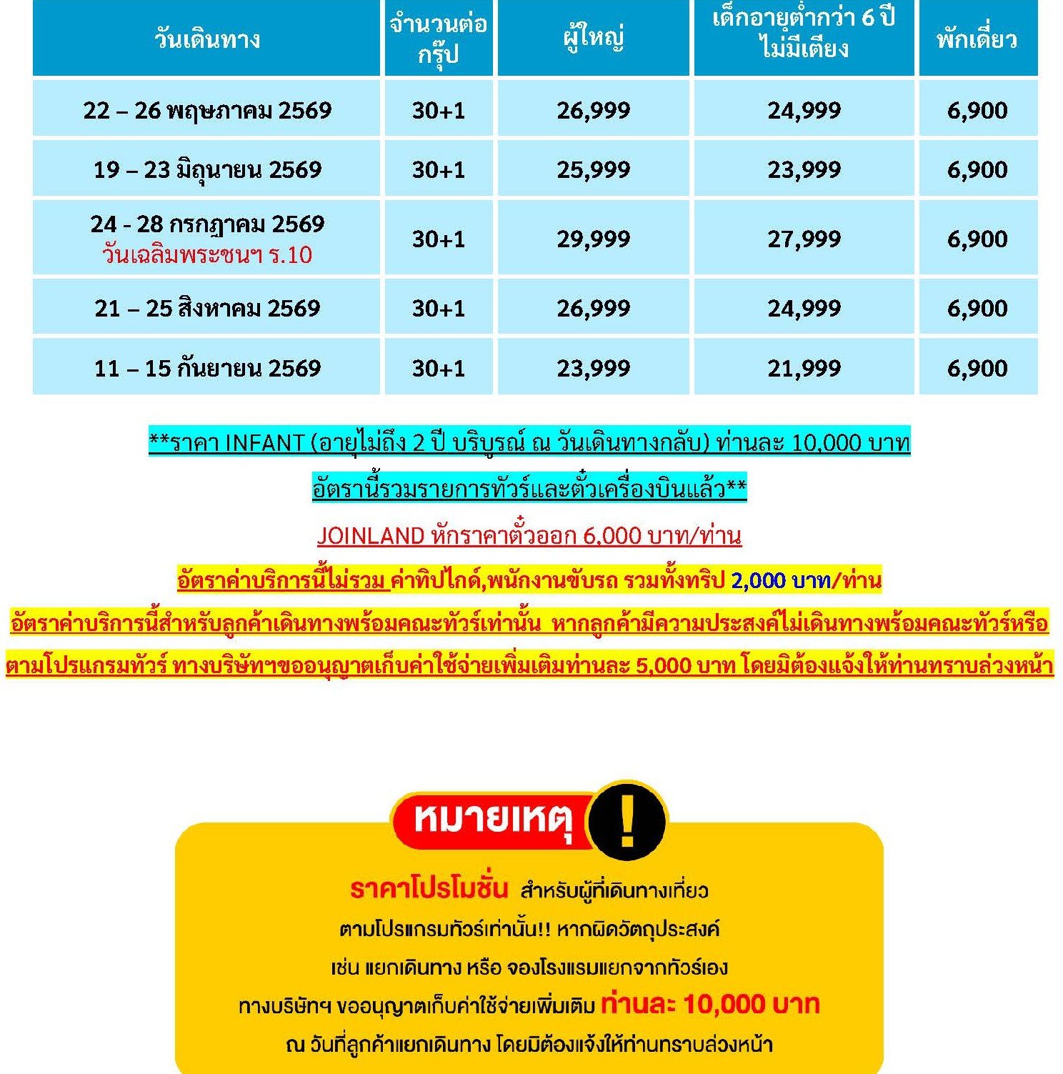 เดินทาง พ.ค. - ก.ย. 69 | โดยสายการบิน THAI VIET JET (VZ) | • เมืองเปปปุ • หมู่บ้านยูฟุอินฟลอร์รัล • ทะเลสาบคินริน • บ่อยูมิ จิโกกุ เมืองฟุกุโอกะ • ศาลเจ้าดาไซฟุ • ดิวตี้ฟรี • Team Lab Forest • ช้อปปิ้งย่านเท็นจิน