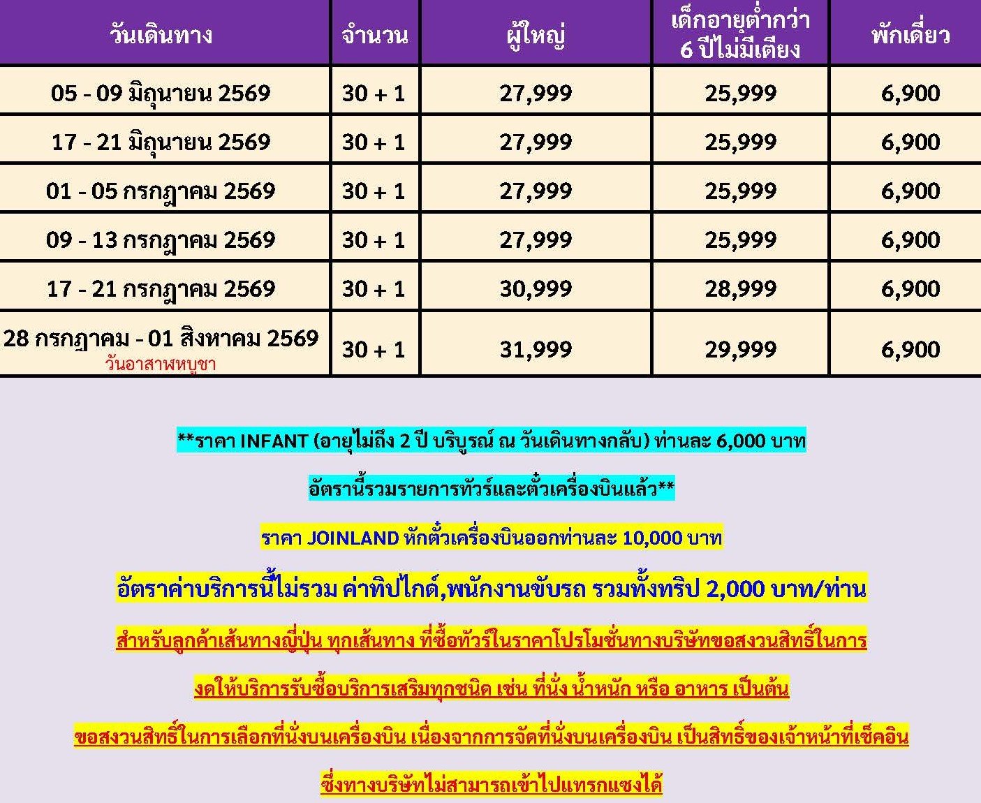 เดินทาง มิ.ย. - ก.ค. 69 | โดยสายการบิน AIR ASIA X (XJ) | • วัดอาซากุสะ • ถนนนากามิเสะ • เมืองมัตสึโมโต้ • อิออน มอลล์ • ปราสาทมัตสึโมโต้ • จังหวัดนากาโน่ • อุทยานคามิโคจิ • สวนโออิชิปาร์ค • ภูเขาไฟฟูชิชั้น 5 • กิจกรรมชงชา • เมืองโตเกียว • ช้อปปิ้งชินจูก