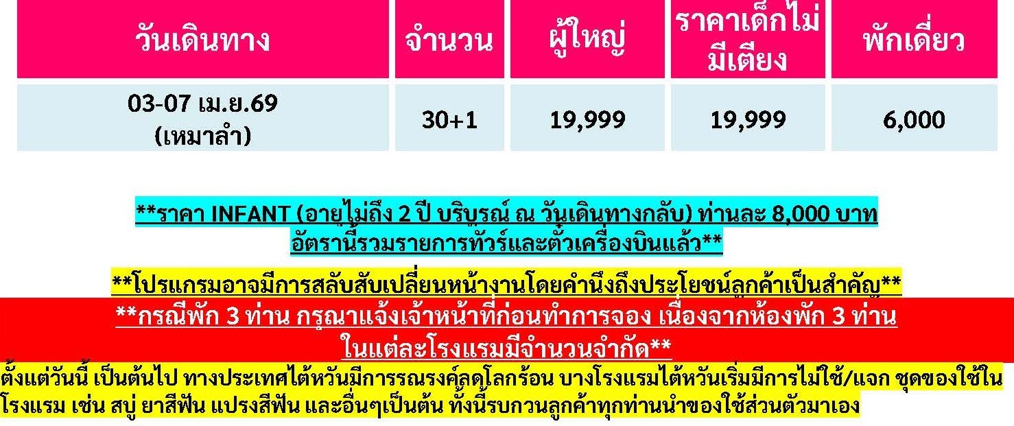 เดินทาง เม.ย. 69 | โดยสายการบิน THAI LION AIR (SL) | • เมืองไถจง ประเทศไต้หวัน • เมืองเจียอี้ • ตลาดเหวินฮวาไนท์มาร์เก็ต • อุทยานแห่งชาติอาลีซาน • เมืองหนานโถว • ร้านพายสับประรด • วัดเหวินหวู่ • ล่องเรือทะเลสุริยันจันทรา • วัดพระถังซำจั๋ง • เมืองไทเป • ซีเหมินติงไนท์มาร์เก็ต • Germanium • เมืองนิวไทเป • ปล่อยโคมลอยเส้นทางรถไฟสายผิงซี • หมู่บ้านโบราณจิ่วเฟิน • ตึกไทเป101(ไม่รวมค่าขึ้นตึกชั้น89) • ตลาดเหลาเหอไนท์มาร์เก็ต • ศูนย์เครื่องสำอาง • เมืองเถาหยวน • วัดเถาหยวนเหว๋ยเทียน • มิซซุยเอ้าท์เลท
