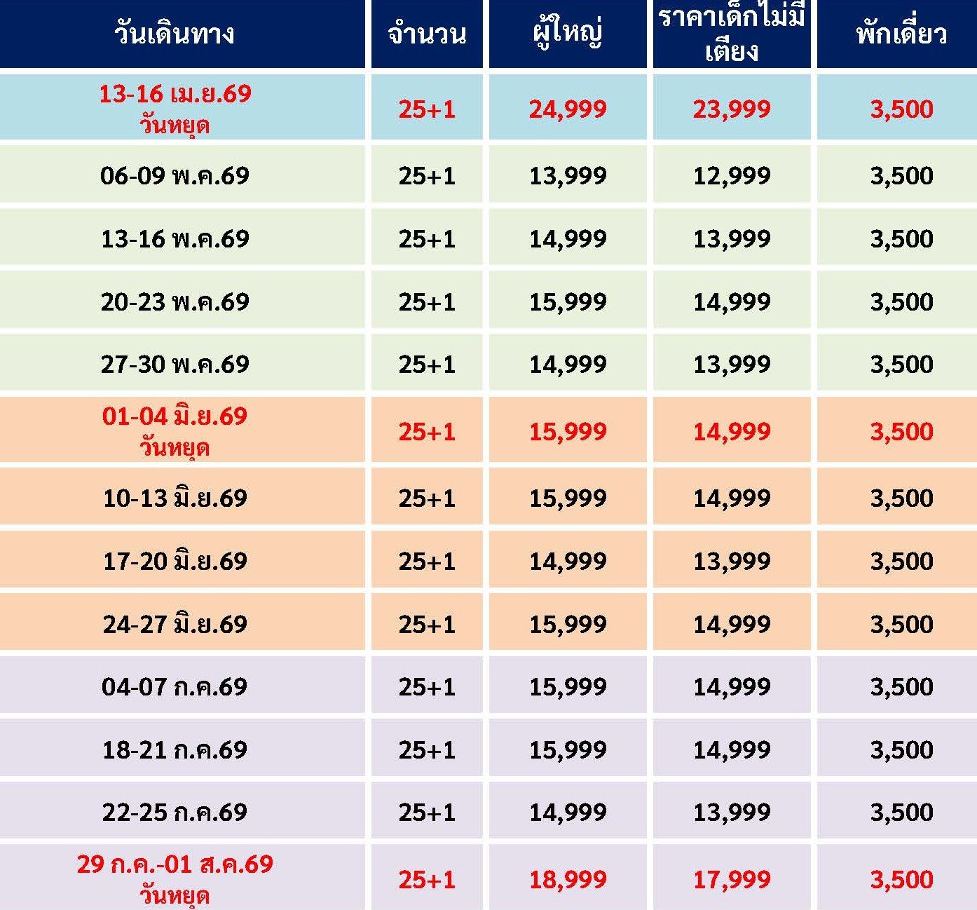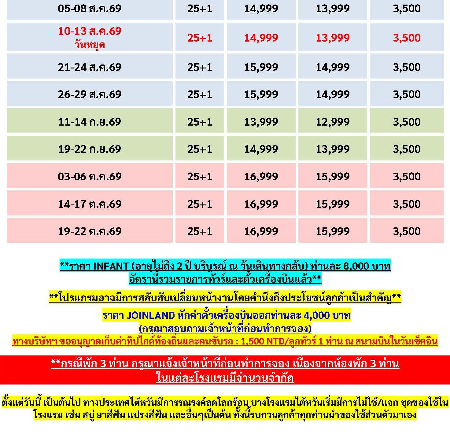 เดินทาง เม.ย. - ต.ค. 69 | โดยสายการบิน THAI VIET JET (VZ) | • เมืองไถจง • มิยาฮาร่าไอศกรีม • ไถจงไนท์มาร์เก็ต • เมืองหนานโถว • ชิมชาอู่หลง • วัดเหวินหวู่ • ล่องเรือชมทะเลสาบสุริยันจันทรา • เมืองไทเป • ร้านพายสับประรด • ซีเหมินติงไนท์มาร์เก็ต • Germanium • เมืองนิวไทเป • หมู่บ้านโบราณจิ่วเฟิ่น • Duty Free • ตึกไทเป 101(ไม่รวมค่าขึ้นตึกชั้น89) • ตลาดกลางคืนเหลาเหอไนท์มาร์เก็ต • ศูนย์เครื่องสำอาง • วัดหลงซาน • อนุสรณ์สถานเจียงไคเช็ค • เมืองเถาหยวน