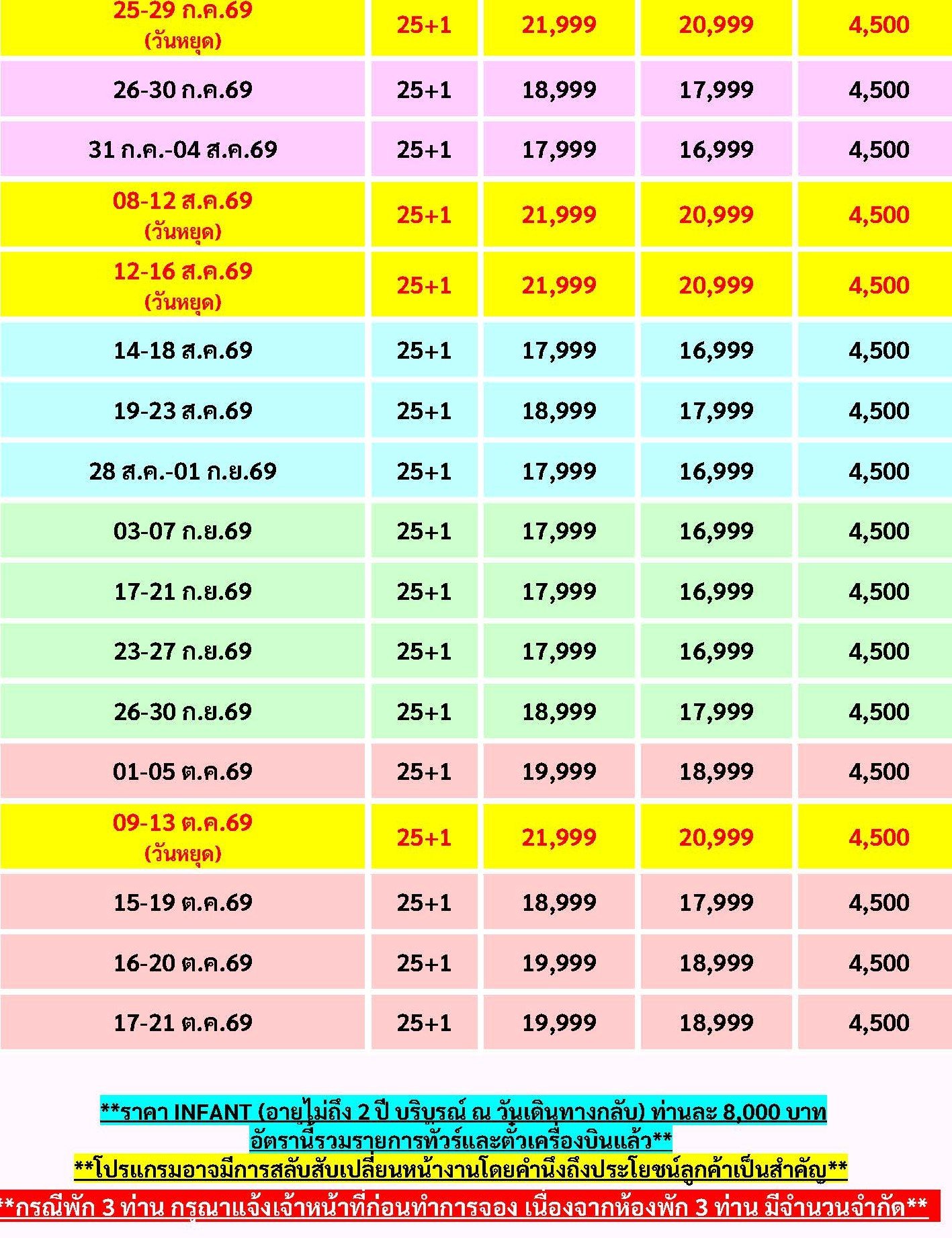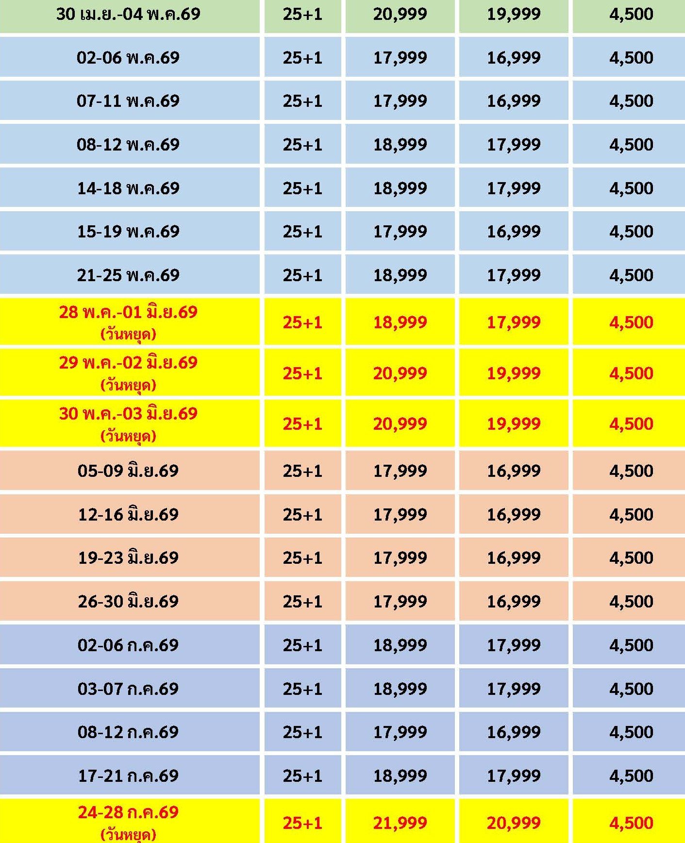 เดินทาง เม.ย. - ต.ค. 69 | โดยสายการบิน THAI VIET JET (VZ) | • เมืองเจียอี้ • ตลาดเหวินฮวาไนท์มาร์เก็ต • ชิมชาอู่หลง • นั่งรถไฟชมอุทยานอาลีซาน • เมืองไถจง • ตลาดไถจงไนท์มาร์เก็ต • เมืองหนานโถว • ร้านพายสับประรด • วัดเหวินหวู่ • ล่องเรือชมทะเลสาบสุริยันจันทราวัดพระถังซำจั๋ง • เมืองไทเป • วัดหลงซาน • ซีเหมินติงไนท์มาร์เก็ต • Germanium • เมืองนิวไทเป • หมู่บ้านชาวประมงหลากสี • หมู่บ้านโบราณจิ่วเฟิ่น • ตึกไทเป101(ไม่รวมค่าขึ้นตึกชั้น89) • ตลาดซื่อหลินไนท์มาร์เก็ต • ศูนย์เครื่องสำอาง • อนุสรณ์สถานเจียงไคเช็ค • ตลาดปลาไทเป • เมืองเถาหยวน