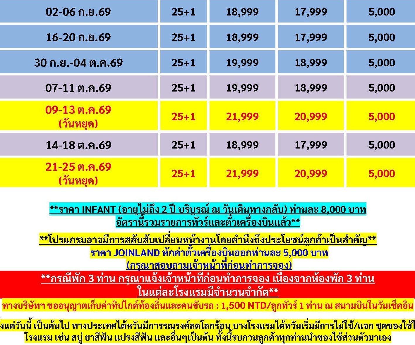 เดินทาง เม.ย. - ต.ค. 69 | โดยสายการบิน THAI LION AIR (SL) | • เมืองเจียอี้ • หมู่บ้านฮิโนกิ • ตลาดกลางคืนเหวินฮวาไนท์มาร์เก็ต • ชิมชาอู่หลง • นั่งรถไฟชมอุทยานอาลีซาน • เมืองไถจง • ไถจงไนท์มาร์เก็ต • เมืองหนานโถว • วัดเหวินหวู่ • ล่องเรือชมทะเลสาบสุริยันจันทรา • วัดพระถังซาจั๋ง • เมืองไทเป • พายสับประรด • ซีเหมินติงไนท์มาร์เก็ต • Germanium • เมืองนิวไทเป • หมู่บ้านโบราณจิ่วเฟิ่น • อุทยานเกาะเหอผิง • หมู่บ้านชาวประมงหลากสี • เมืองไทเป • ตลาดกลางคืนหนิงเซี่ย • ศูนย์เครื่องสำอาง • วัดหลงซาน • อนุสรณ์สถานเจียงไคเช็ค • ตึกไทเป101(ไม่รวมค่าขึ้นตึก) • เมืองเถาหยวน • กลอเรียเอ้าท์เลท
