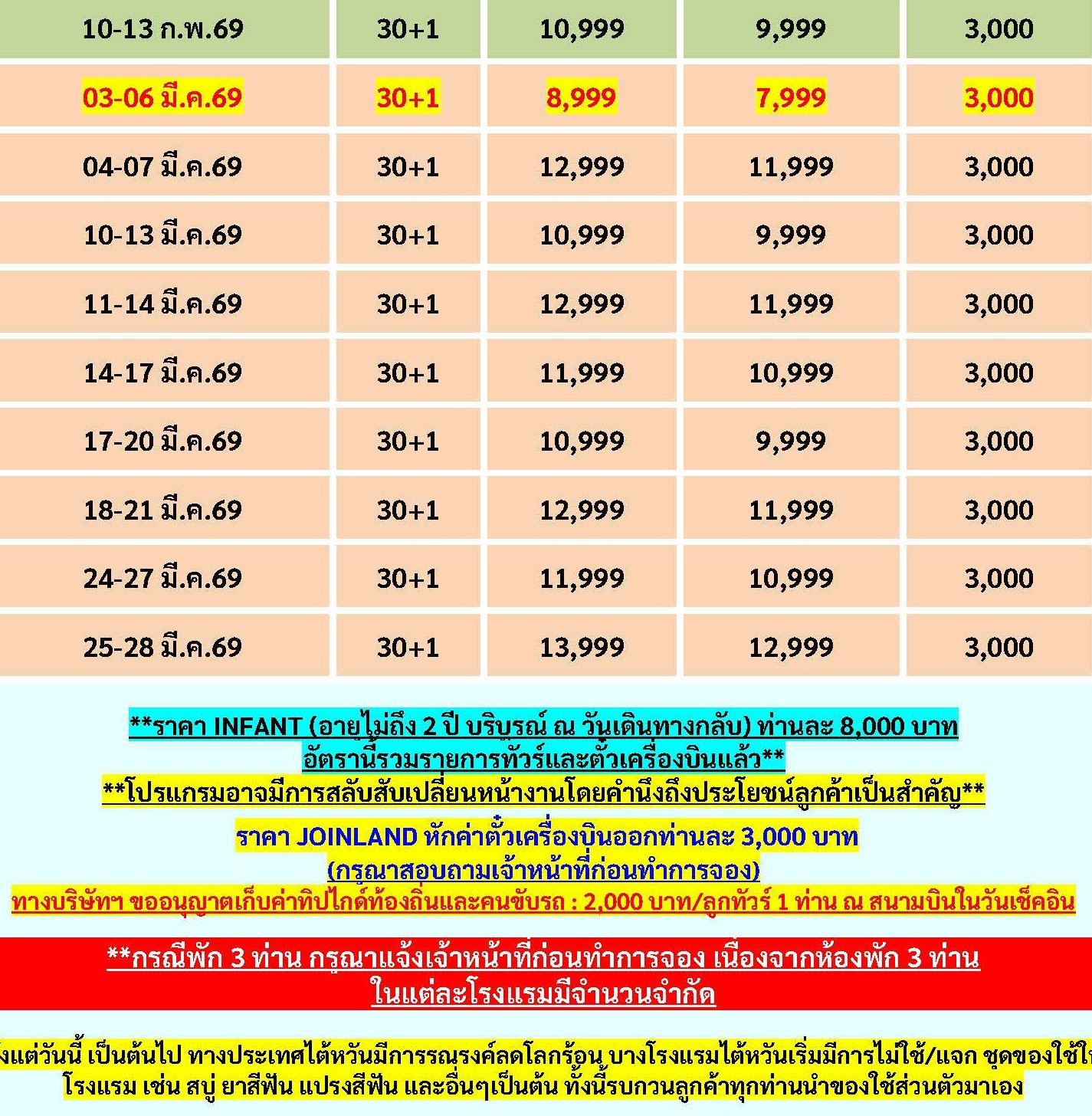 เดินทาง มี.ค. 69 | โดยสายการบิน THAI VIET JET (VZ) | • อุทยานแห่งชาติเย๋หลิ่ว•หมู่บ้านชาวประมงหลากสี • หมู่บ้านโบราณจิ่วเฟิ่น • Duty Free • ซีเหมินติงไนท์มาร์เก็ต • Germanium • เมืองนิวไทเป • วัดอู๋จีเทียนหยวน • ร้านพายสับปะรด • อนุสรณ์สถานเจียงไคเช็ค • วัดหลงซาน • ตลาดกลางคืนฮวาซี • วัดเทียนโฮ่ว • ศูนย์เครื่องสำอาง • ตึกไทเป101(ไม่รวมค่าขึ้นตึกชั้น89) • Mitsui Outlet
