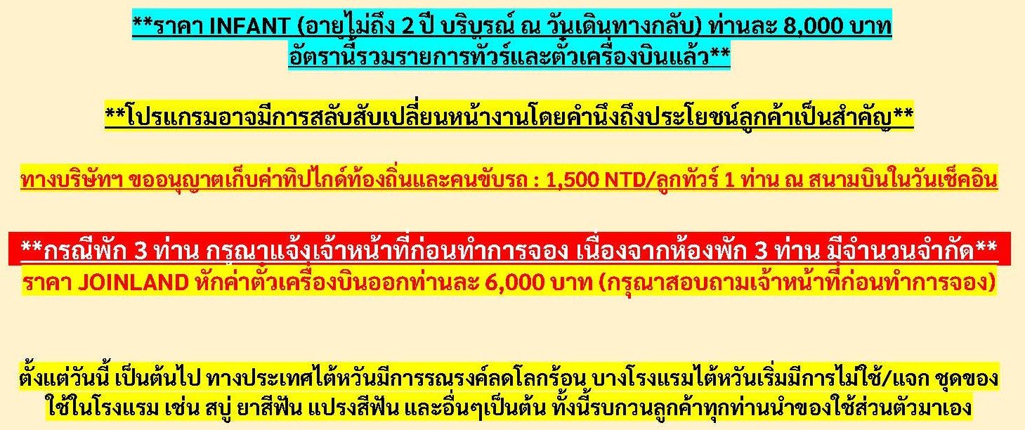 หมวดหมู่ : ประเภททัวร์ ,  ทัวร์แนะนำ ,  โดยสายการบิน ,  CHINA AIRLINES (CI) ,  Taiwan ,