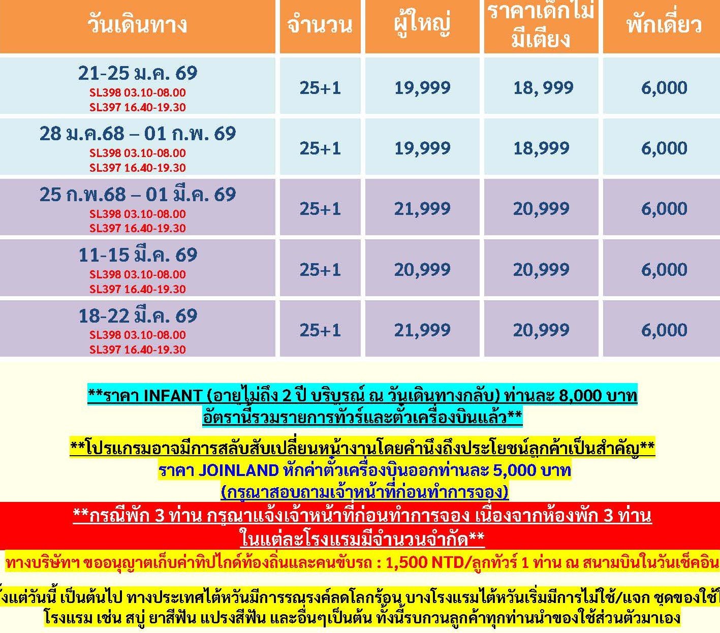 เดินทาง มี.ค. 69 | โดยสายการบิน THAI LION AIR (SL) | • เมืองหนานโถว • ล่องเรือชมทะเลสาบสุริยันจันทรา • วัดพระถังซาจั๋ง • วัดเหวินหวู่ • เมืองเจียอี้ • ตลาดกลางคืนเหวินฮัวไนท์มาร์เก็ต • ชิมชาอู่หลง • นั่งรถไฟชมอุทยานอาลีซาน • เมืองไถจง • ไถจงไนท์มาร์เก็ต • เมืองไทเป • ร้านพายสับประรด • ตึกไทเป101(ไม่รวมค่าขึ้นตึกชั้น89) • Germenium • อนุสรณ์สถานเจียงไคเช็ค • ซีเหมินติงไนท์มาร์เก็ต • วัดหลงซาน • ศูนย์เครื่องสำอาง • อุทยานแห่งชาติเย๋หลิ่ว • หมู่บ้านชาวประมงหลากสี • หมู่บ้านโบราณจิ่วเฟิ่น • แช่น้าแร่ • กลอเรียเอ้าท์เลท