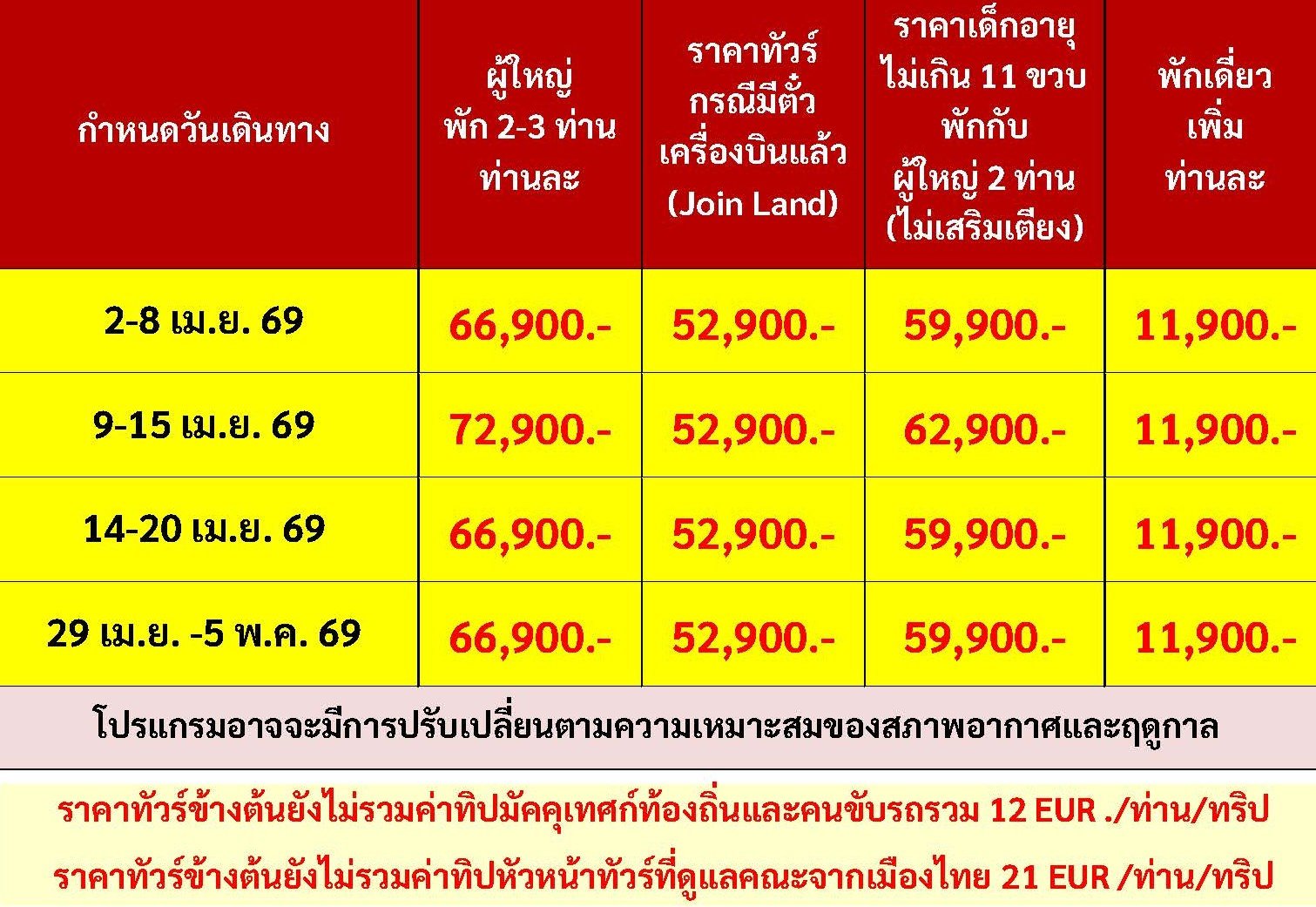 เดินทาง เม.ย. 69 | โดยสายการบิน QATAR AIRWAYS (QR) | • มิลาน • ตูริน • เจนัว • ซานต้า มาการิต้า ลิกูเรีย • ปอร์โตฟิโน่ • ปิอาเชนซ่า • ซีร์มิโอเน่ • หมู่บ้านซานตาแมดดาเลนา • โบลซาโน • ทะเลสาบเบรียส • ทะเลมิสุรินา • เวโรนา • บ้านจูเลียต • ทะเลสาบโคโม