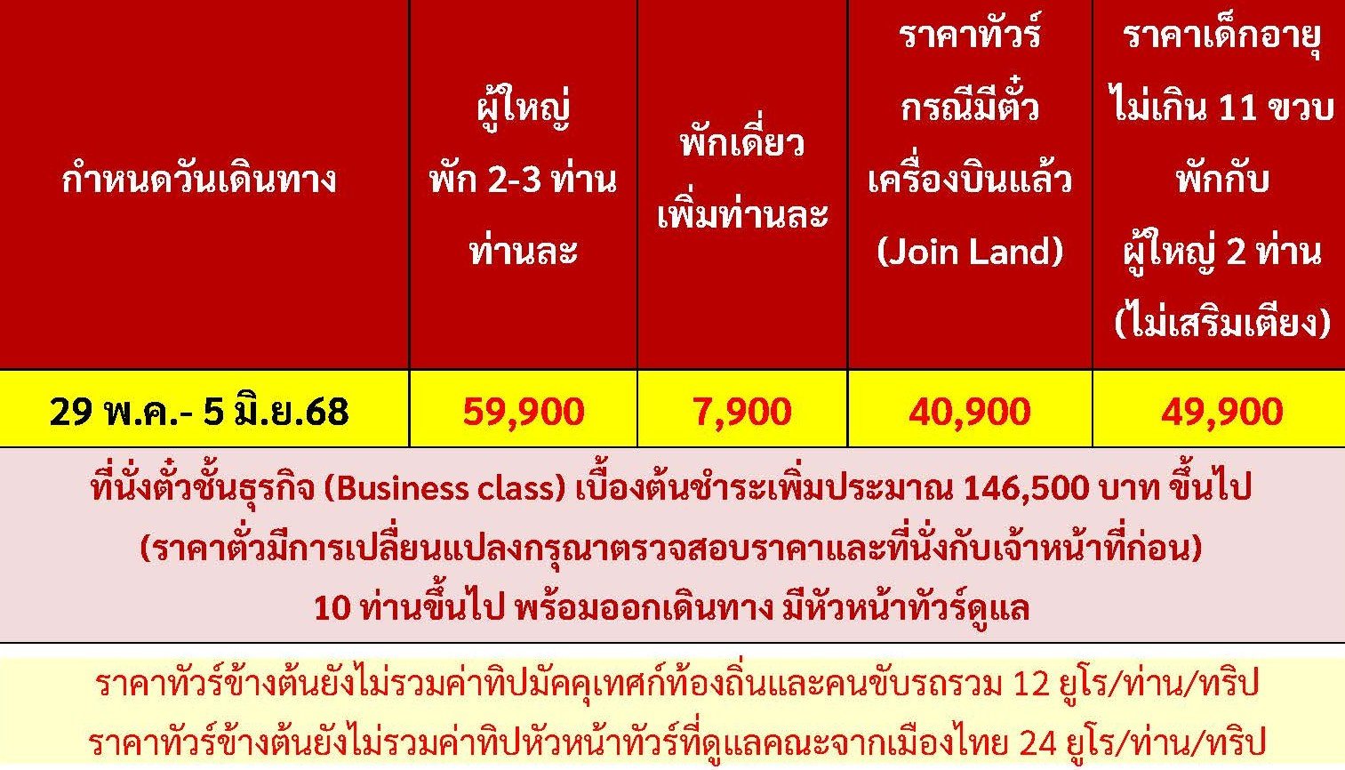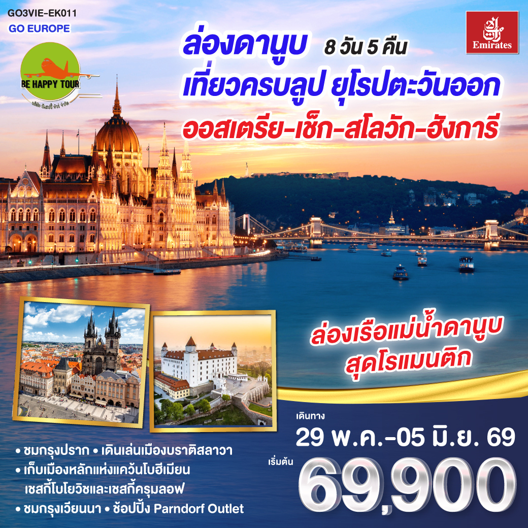 เดินทาง พ.ค. 69 | โดยสายการบิน EMIRATES (EK) | • เวียนนา • เชสกี้บูโยวิช • เชสกี้ครุมลอฟ • ปราก เขตเมืองเก่ากรุงปราก • สะพานชาร์ล • เมนูเป็ดโบฮีเมียน • ปราก • ถ่ายรูปปราสาทปราก • บราติสลาวา • บูดาเปสต์ • ล่องเรือแม่น้ำดานูบ • เมนูซุปกูลาซ • ช้อปปิ้ง Parndorf Outlet • เวียนนา • ชมกรุงเวียนนา • เดินเล่นถนนคาร์ทเนอร์
