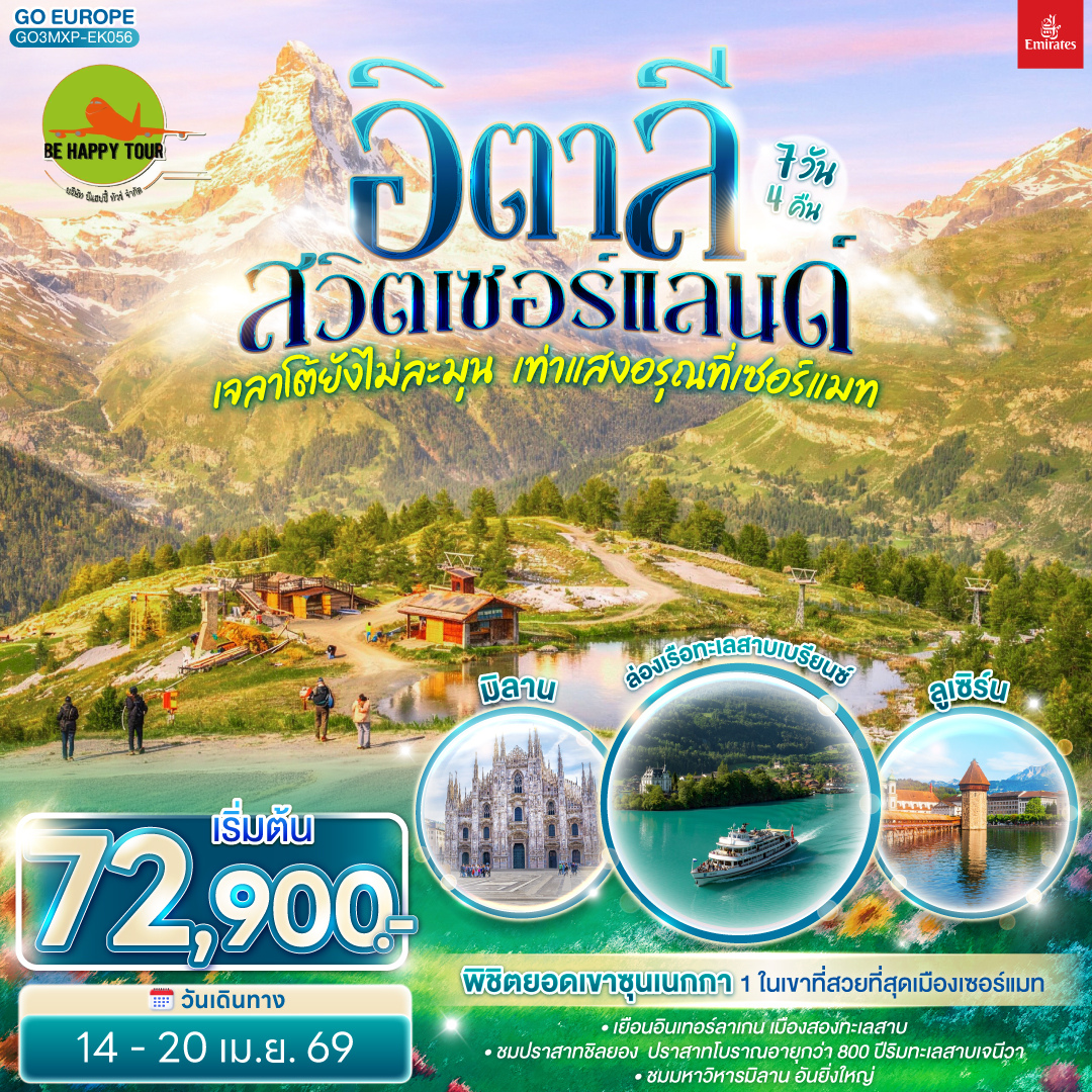 เดินทาง เม.ย. 69 | โดยสายการบิน EMIRATES (EK) | • มิลาน • ลูเซิร์น • ซูริค • ซุก • ล่องเรือทะเลสาบเบรียนซ • อินเทอร์ลาเก้น • เบิร์น • กรุยแยร์ • มองเทอรซ์ • ปราสาทชิลยอง • ซียง • เซอร์แมท • นั่งรถรางสู่ยอดเขาซุนเนกก้า • ตูริน • Serravalle designer outlet • มิลาน • มิลานดูโอโม