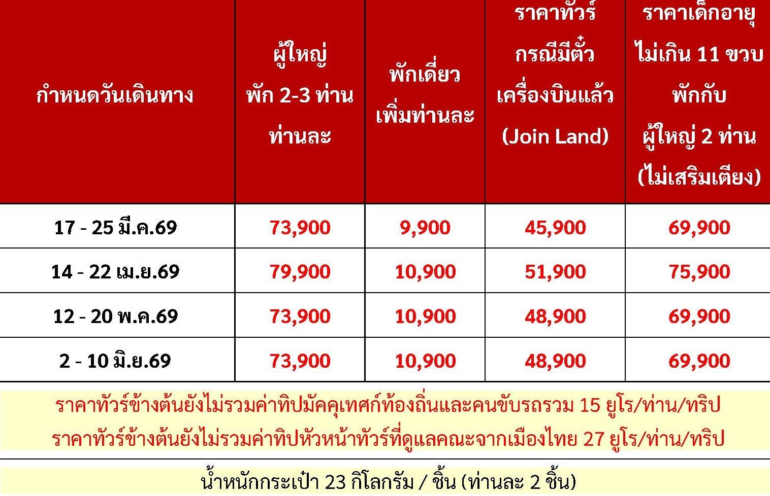 เดินทาง เม.ย. - มิ.ย. 69 | โดยสายการบิน EVA AIR (BR) | • เวียนนา • เยอร์ • เมืองเก่าและศาลาว่าการเมือง • จัตุรัสเซเชนยี • บูดาเปสต์ • คาสเซิลฮิลล์ ป้อมชาวประมง โบสถ์แมทเธียส • ล่องเรือแม่น้ำดานูบ • Parndorf Outlet • บราติสลาวา เมืองเก่า ปราสาทบราติสลาวา • เบอร์โน เมืองเก่า • กรุงปราก • เข้าชมปราสาทปราก เดอะโกลเด้นเลน • คาร์โรวีวารี่ • ปราก สะพานชาร์ล เมืองเก่า นาฬิกาดาราศาสตร์ • เชสกี้ ครุมลอฟ • ซาลสบูร์ก • สวนมิราเบล • ฮัลสตัท • เวียนนา • ถนนคาร์ทเนอร์ • ชมเมือง ถ่ายรูปพระราชวังเชิร์นบรุน พระราชวังฮอฟเบิร์ก อาคารรัฐสภา • โบสถ์เซ้นต์สตีเฟ่น