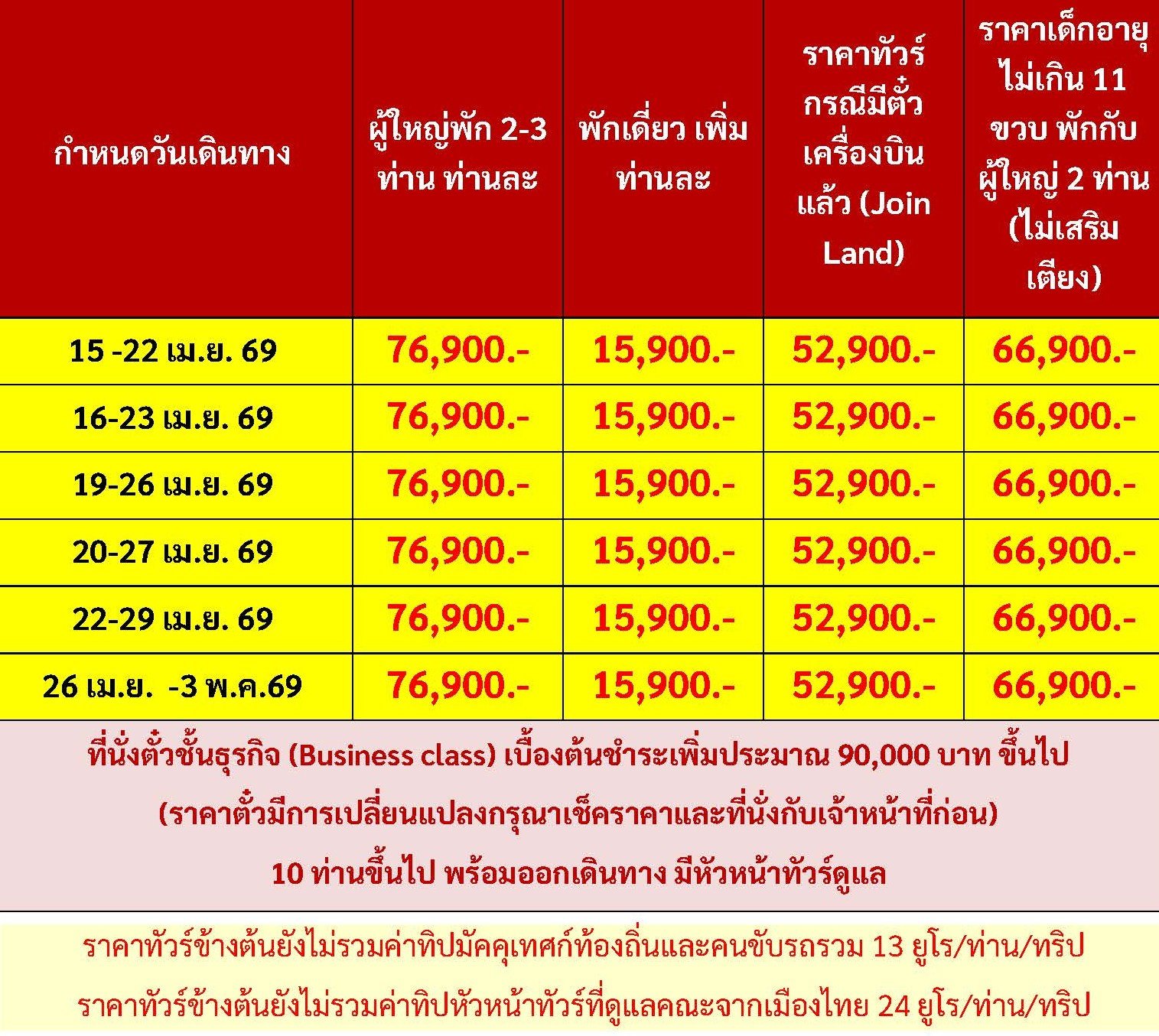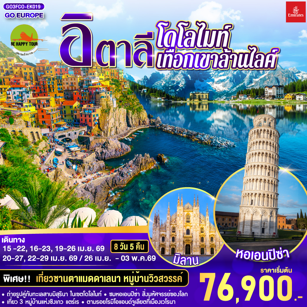 เดินทาง เม.ย. 69 | โดยสายการบิน EMIRATES (EK) | • โรม • วาติกัน • มหาวิหารเซนท์ปีเตอร์ • โคลอสเซียม • โรมันฟอรัม • บันไดสเปน • น้ำพุเทรวี • เซียนา • ปิซ่า • หอเอนปิซา • นั่งรถไฟเข้าสู่ ชิงเกว แตร์เร • หมู่บ้านริโอแมกจิโอเร่ • หมู่บ้านมานาโรล่า • หมู่บ้านเวอร์นาซซา • ปาร์มา • โบลซาโน • ซานตาแมดดาเลนา • เทรนโต • ทะเลสาบเบรียส • ทะเลสาบมิสุรินา • เวนิสเมสเตร้ • เกาะเวนิส เวโรนา • เวโรนาอารีนา • บ้านจูเลียต • มิลาน • มหาวิหารมิลาน • โคโม • ทะเลสาบโคโม