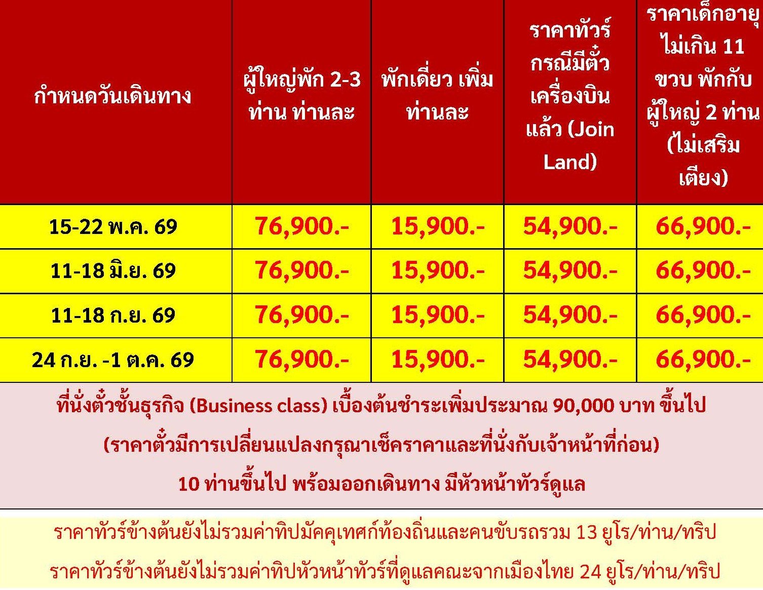 เดินทาง พ.ค. - ก.ย. 69 | โดยสายการบิน EMIRATES (EK) | • มิลาน • Serravalle outlet • เบรสชา • ออร์ทิเซ่ • ขึ้นกระเช้าสู่แอลป์ ดิ ซุสเซ่ • ถ่ายรูปทะเลสาบเบรียส • ทะเลสาบมิสุริน่า • โบลซาโน • นั่งเรือเข้าสู่เกาะเวนิส • ชมสะพานถอนหายใจ • ถ่ายรูปบริเวณจัตุรัสซานมาร์โค • เวนิส เมสเตร้ • ฟลอเร้นซ์ • มหาวิหารซานตา มาเรีย เดล ฟิโอเร • จัตุรัสเดลลาซิญญอเรีย • ปิซ่า • จัตุรัสกัมโป เดย์ มีราโกลี • ถ่ายรูปกับหอเอนปิซ่า • ลา สเปเซีย • นั่งรถไฟเข้าสู่ ชิงเกว แตร์เร • หมู่บ้านริโอแมกจิโอเร่ • หมู่บ้านมานาโรล่า • หมู่บ้านแวร์นาซซา • โรม • วาติกัน • ถ่ายรูปมหาวิหารเซ้นต์ปีเตอร์ • ถ่ายรูปโคลอสเซี่ยม • ชมน้ำพุเทรวี่ • ช้อปปิ้งย่านบันไดสเปน