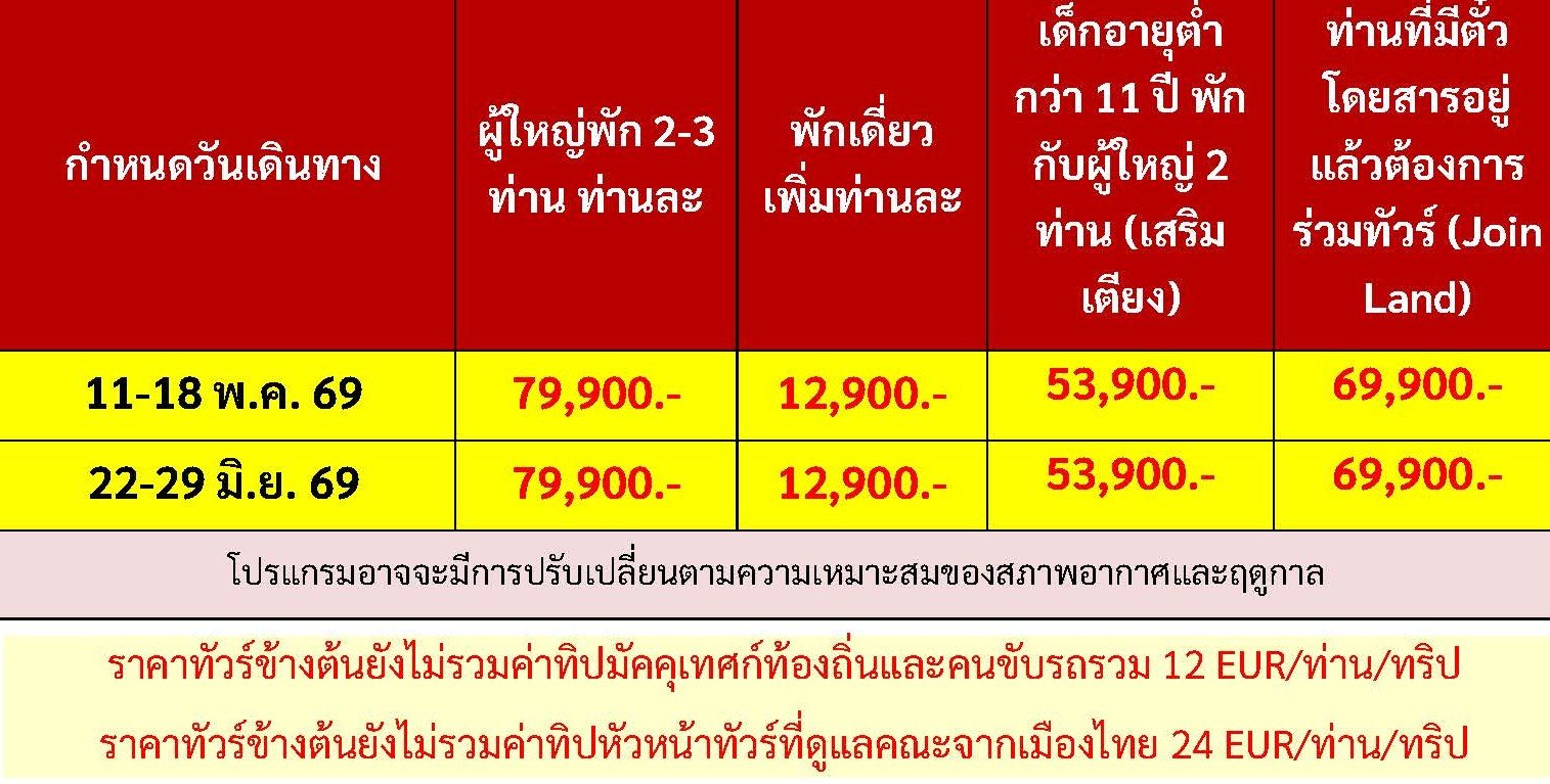 หมวดหมู่ : ประเภททัวร์ ,  ทัวร์แนะนำ ,  โดยสายการบิน ,  SINGAPORE AIRLINES (SQ) ,  Europe ,