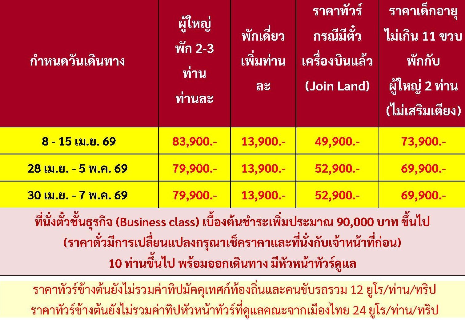 เดินทาง เม.ย. 69 | โดยสายการบิน EMIRATES (EK) | • มิวนิค • เดินเล่นชมเมือง • ถ่ายรูปจัตุรัสมาเรียนพลาสท์ • โรเซนไฮม์ • ซาลส์บวร์ก • สวนมิราเบลล์ • บ้านโมสาร์ท • ฮัลสตัท • อินส์บรูค • หมู่บ้านโอเบอร์รามาเกา • เอททัล • สำนักสงฆ์แห่ง • เข้าชมปราสาทนอยชวานสไตน์ • ป่าดำ • วิลลินเก้น • อินเทอร์ลาเก้น • ยอดเขาฮาร์ดเดอร์คลุม • เบิร์น • ซูริค • น้ำตกไรน์ • ซุก • ลูเซิร์น