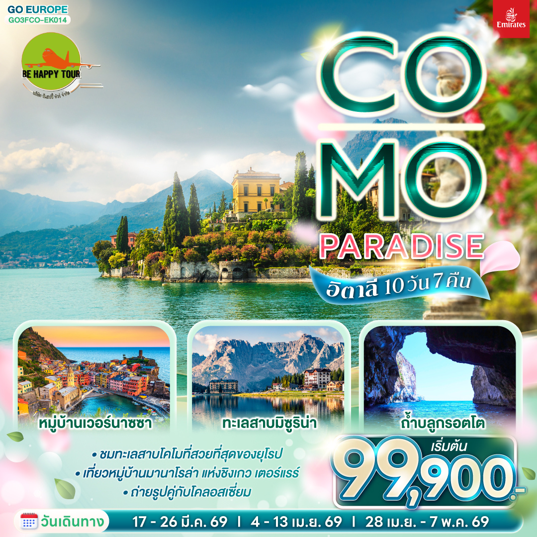 เดินทาง เม.ย. 69 | โดยสายการบิน EMIRATES (EK) | • โรม • วาติกัน • ถ่ายรูปโคลอสเซี่ยม • น้ำพุเทรวี่ • ย่านบันไดสเปน • เมืองปอมเปอี • โพสิตาโน • อมาลฟี่โคสท์ • ซอร์เรนโต • ล่องเรือ Hydrofoil สู่เกาะคาปรี • ชมถ้ำบลูกรอตโต • เนเปิลส์ • เซียนา • ซานจิมิอาโน • ลุกก้า • ลา สเปเซีย • นั่งรถไฟเข้าสู่ ชิงเกว แตร์เร • หมู่บ้านริโอแมกจิโอเร่ • หมู่บ้านมานาโรล่า • หมู่บ้านเวอร์นาซซา • ปาร์มา • เวโรนา • บ้านจูเลียต • หมู่บ้านซานต้าแมดดาเลนา • บริกเซน • ขึ้นกระเช้าสู่แอลป์ ดิซุสเซ่ • ทะเลสาบคาเรซซา • ทะเลสาบมิสุรินา • ทะเลสาบเบรียส • โบลซาโน • มิลาน • แกลเลอรี วิคเตอร์ เอ็มมานูเอล • ทะเลสาบโคโม