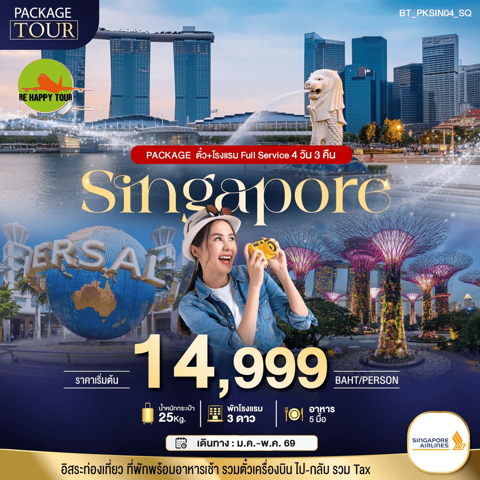 เดินทาง พ.ค. 69 | โดยสายการบิน SINGAPORE AIRLINES (SQ) | • สวนสนุกยูนิเวอร์แซลสตูดิโอสิงคโปร์ • S.E.A. Aquarium in Singapore • Gardens By the Bay 2 Dome • สิงคโปร์ฟลายเออร์ • Singapore River Bumboat Cruise • ย่านลิตเติ้ลอินเดีย • ย่านท่าเรือคลาร์กคีย์ • วัดศรีมาริอัมมัน • วัดเทียนฮอกเกี่ยน • MICA Building • The Hive Future World - Where Art Meet Science • Raffles Marina Lighthouse • อุโมงค์ต้นไม้ฟอร์ทแคนนิ่ง
