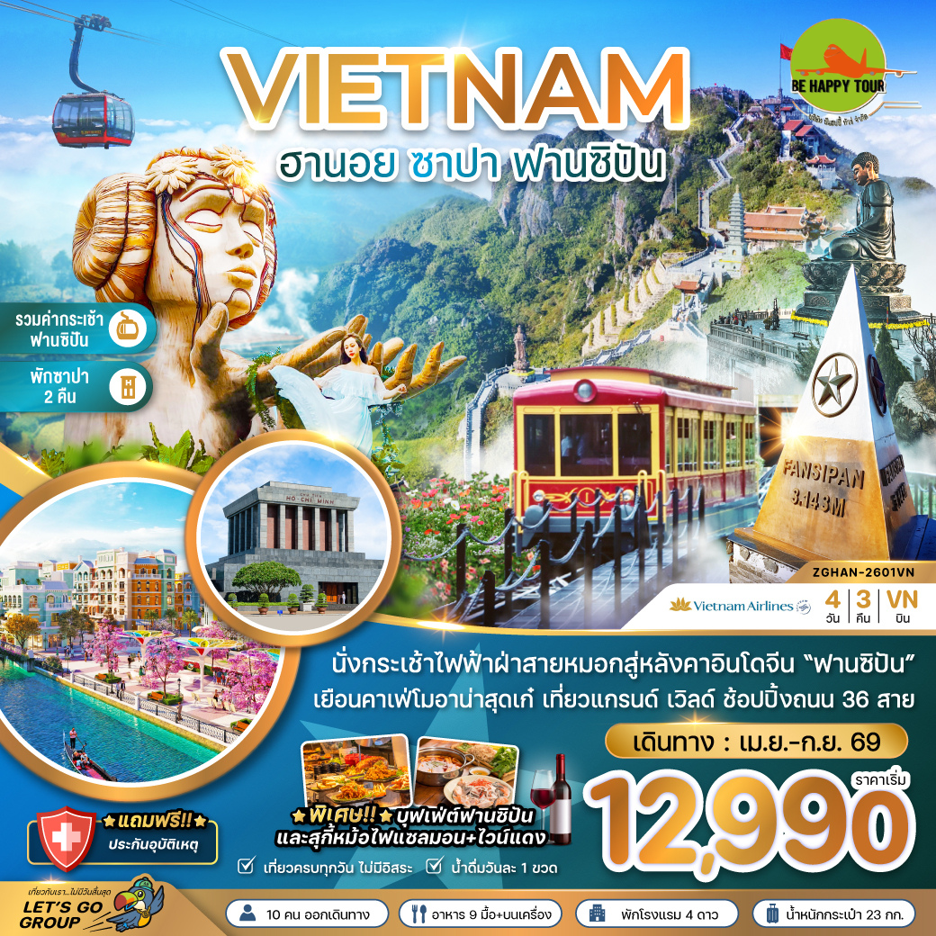 เดินทาง เม.ย. - ก.ย. 69 | โดยสายการบิน VIETNAM AIRLINES (VN) | • เมืองฮานอย • สุสานโฮจิมินห์ • วัดเฉินก๊วก • ถนน 36 สาย • ทะเลสาบคืนดาบ • โบสถ์เซนต์โจเซฟ • เมืองซาปา • ด่านชายแดนเวียดนาม • จีน • ตลาดเลิฟมาร์เก็ต • ซันพลาซ่า ซาปา สเตชั่น • ยอดเขาฟานซิปัน • โมอาน่า ซาปาคาเฟ่ • โบสถ์หินซาปาเมืองตามด๋าว • GIO CAFE TAM DAO • โบสถ์หินตามด๋าว • ตามด๋าว สแควร์ • ตลาดกลางคืนตามด๋าว
