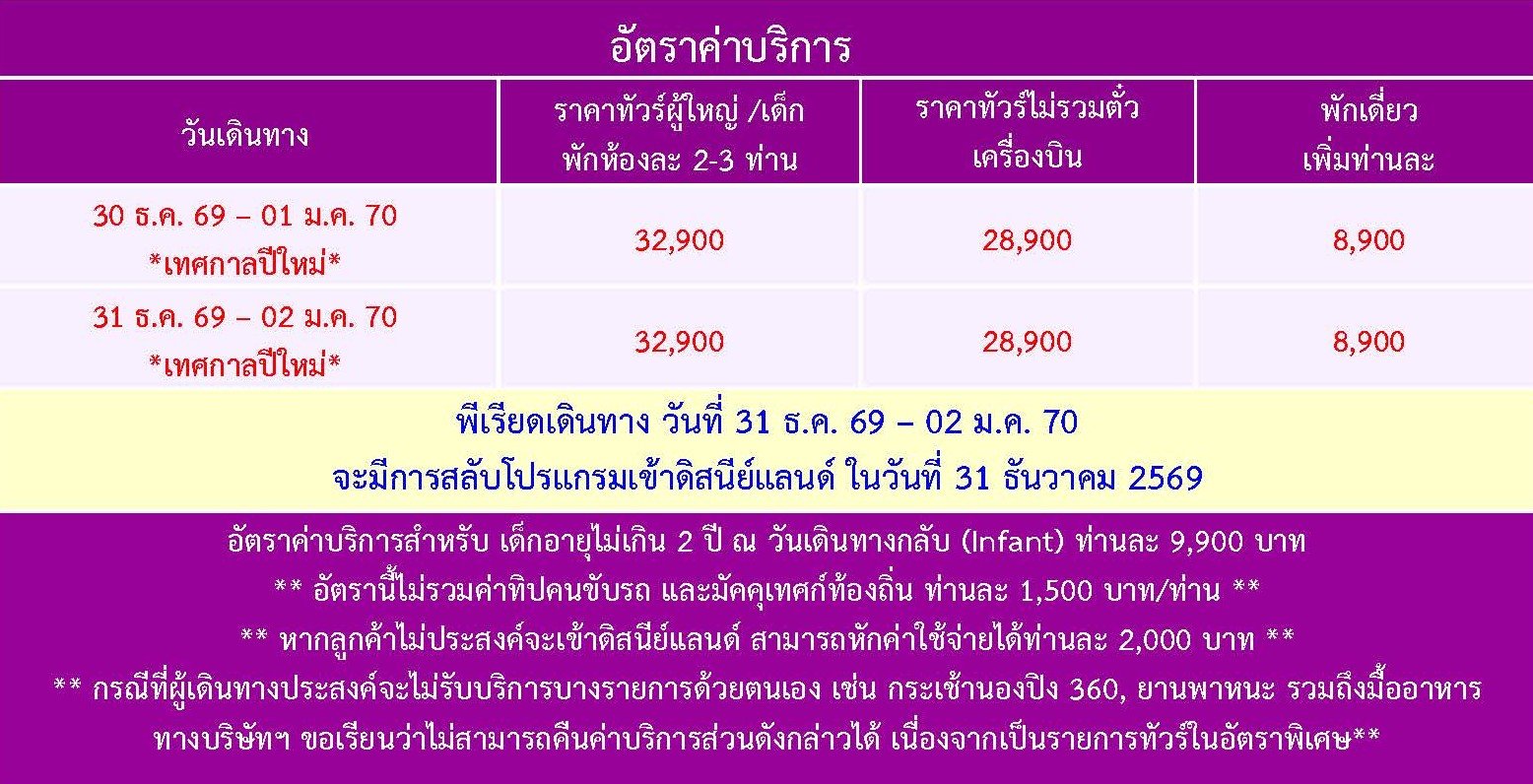 เดินทาง ธ.ค. 69 | โดยสายการบิน THAI AIRWAYS (TG) | • กระเช้านองปิง 360 • พระใหญ่เกาะลันเตา • เจ้าแม่กวนอิมรีพัลส์เบย์ • เที่ยวสวนสนุกฮ่องกงดิสนีย์แลนด์ • วัดเจ้าแม่กวนอิมฮ่องฮำ • วัดหวังต้าเซียน • โรงงานจิวเวอร์รี่ • ร้านหยก • วัดแชกงหมิว