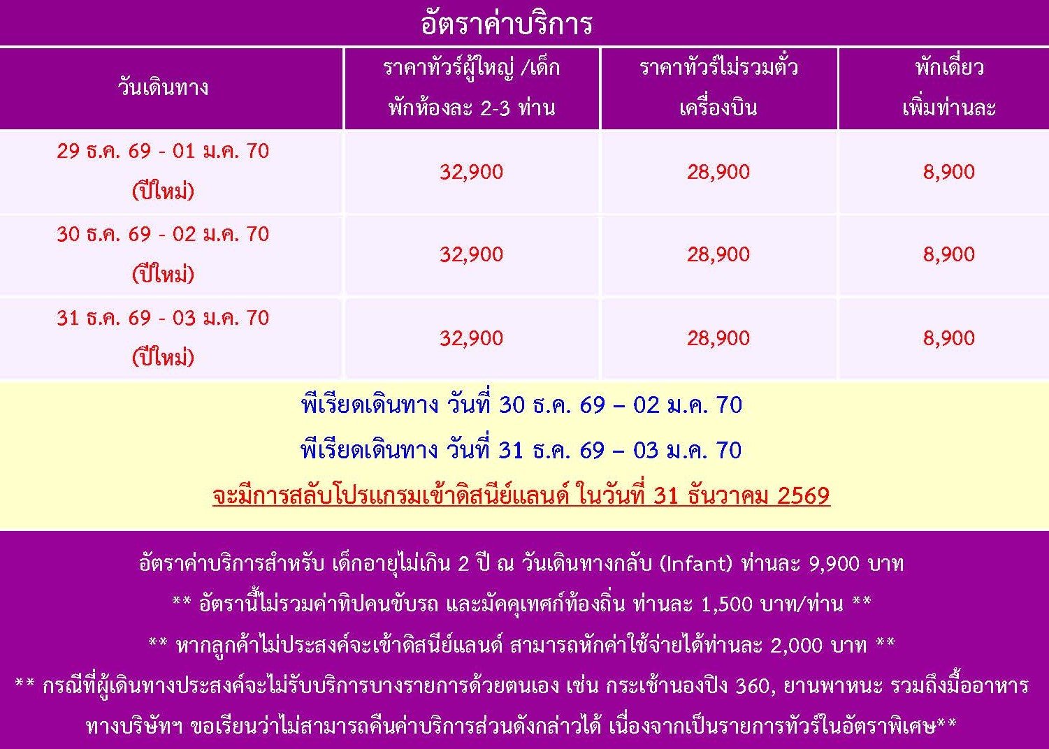 เดินทาง ธ.ค. 69 | โดยสายการบิน THAI AIRWAYS (TG) | • กระเช้านองปิง 360 • พระใหญ่เกาะลันเตา • เจ้าแม่กวนอิมรีพัลส์เบย์ • เที่ยวสวนสนุกฮ่องกงดิสนีย์แลนด์ • อิสระท่องเที่ยวตามอัธยาศัย • วัดเจ้าแม่กวนอิมฮ่องฮำ • โรงงานจิวเวอร์รี่ • ร้านหยก • วัดแชกงหมิว